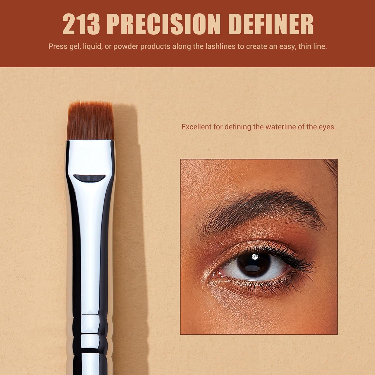 213 Precision Definer: Ues this flat eyeliner brush to press gel, liquid, or powder products along the lashlines to create an easy, thin line. Excellent for defining the waterline of the eyes.