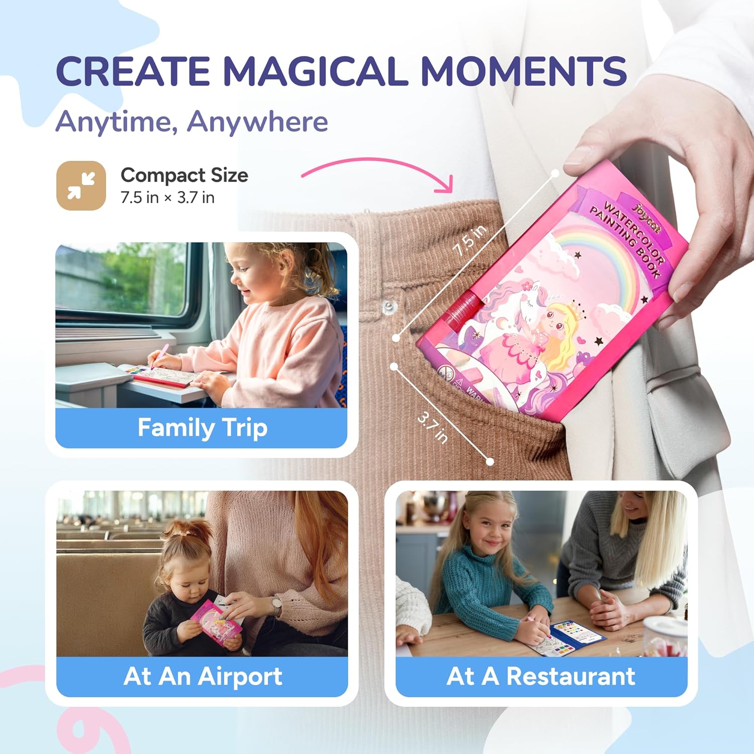 3-in-1 Magical Art Adventure: Each watercolor book includes a refillable brush, 6 watercolor paints, and 20 coloring pages. With safe, parent-approved materials, kids can easily dip into vibrant colors, watch their artwork come alive with a little water, and enjoy a creative craft time that sparks imagination