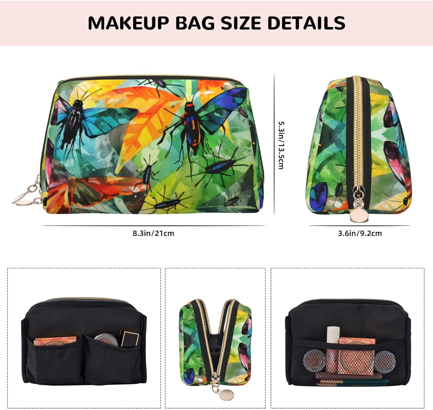 For those who value everyday convenience, this Insects of all kinds printed leather portable cosmetics bag is a perfect companion! Its unique zipper design allows for smooth closure and maximum opening, allowing you to quickly find your eyeshadow, lipstick, pressed powder, and more, whether you’re organizing your makeup at home in the morning or needing a touch-up on the go. The high-quality foam lining is incredibly practical, ensuring your foundation and eyeshadow palettes are securely cushioned and protected from bumps and bumps, even when you toss the bag in your backpack. Even more impressive is the premium leather’s smooth, textured feel, and the beautiful print creates a striking aesthetic – it feels like a stylish accessory when carried in your hand, or adds a cozy touch to your desk or dressing table. Whether carrying it on your daily commute or packing it in your luggage for a short trip, this bag combines practicality and style, making organizing and applying your makeup a breeze and a joy.