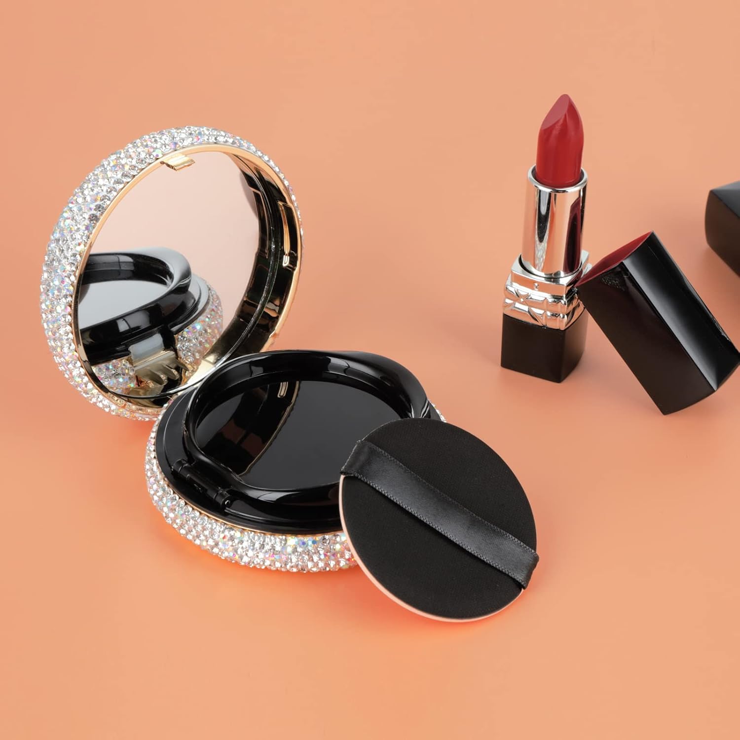 Makeup Powder Empty Box with Bling Diamond Loose Powder Compact Empty Container with Powder Puff and Mirror Refillable for Home or Trip