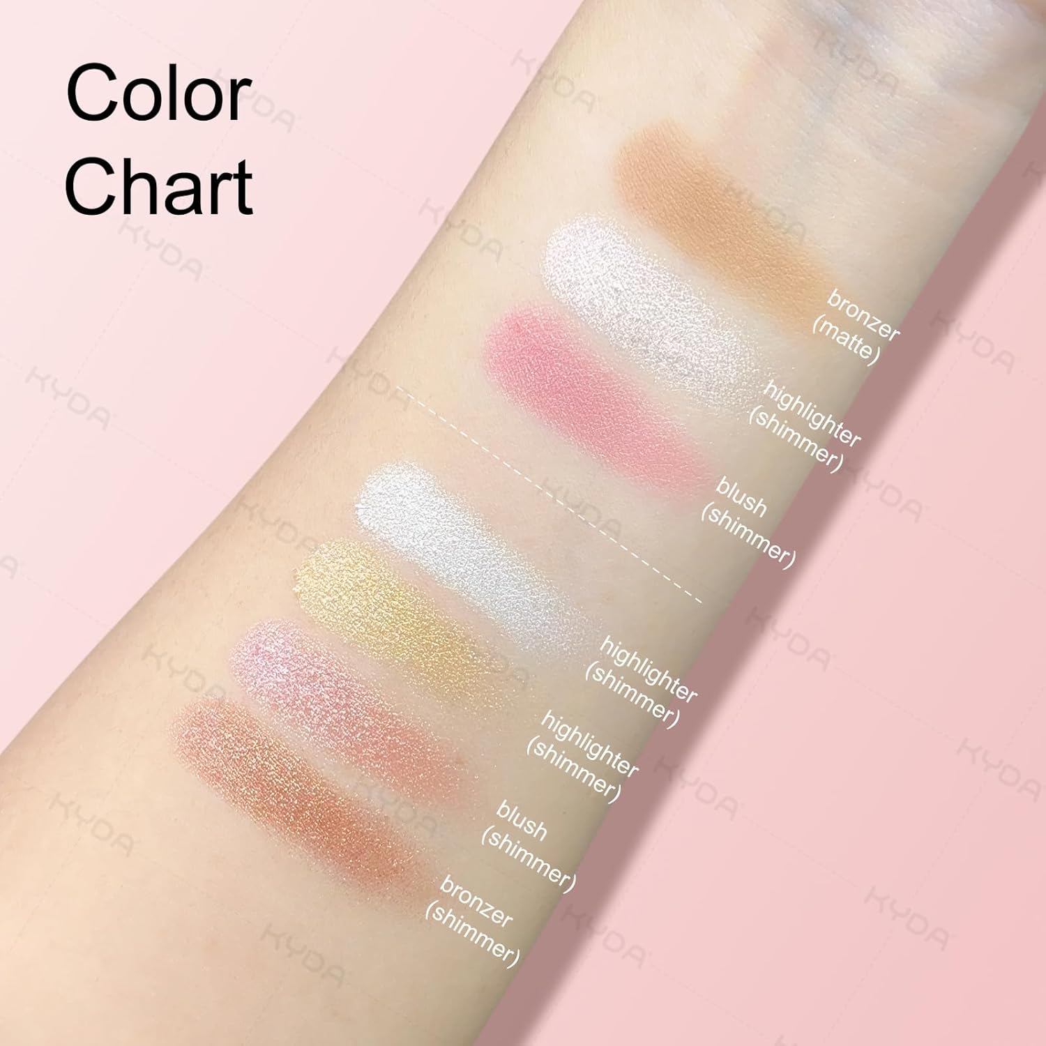 KYDA 3-In-1 GLOW MAKEUP PALETTE – KYDA Glow Makeup Palette contains shimmer pink blushes, pearl white highlighter, warm matte bronzer/contour, no matter what skin tone, there is always a suitable shade here.