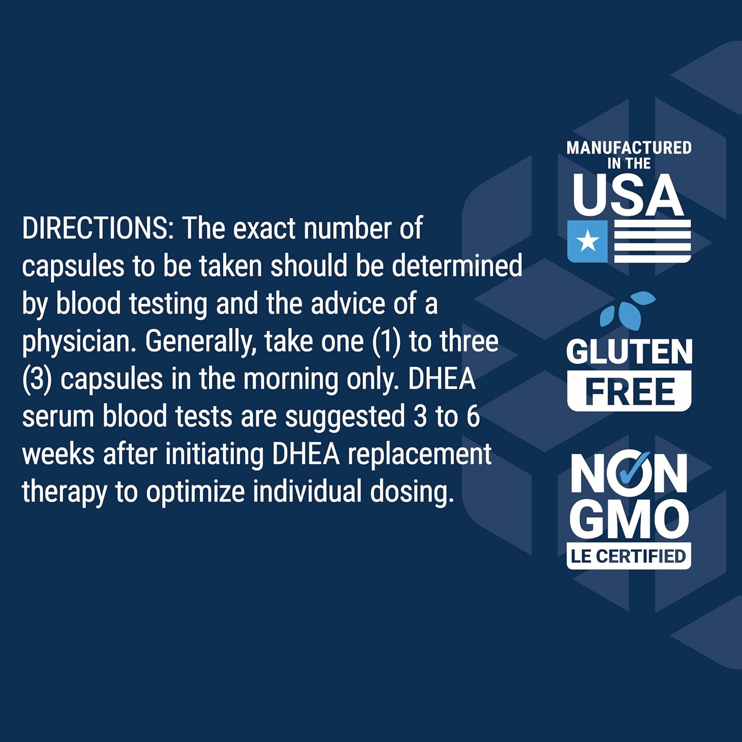 Keep DHEA levels in check—In order to develop a personalized DHEA regimen, doing regular blood work to evaluate blood levels and determine accurate dosage. Our DHEA formula is available in four different dosages to meet your specific needs.