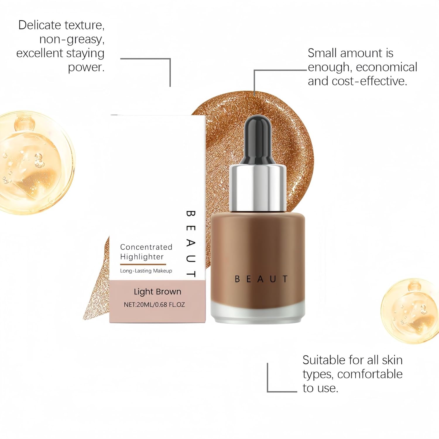 Rich Bronze Gold Luminosity:Specifically crafted for medium to deep skin tones, these Light Brown highlighter drops deliver a rich, warm bronze-gold radiance. Achieve a sculpted effect with a luxurious and deep glow.