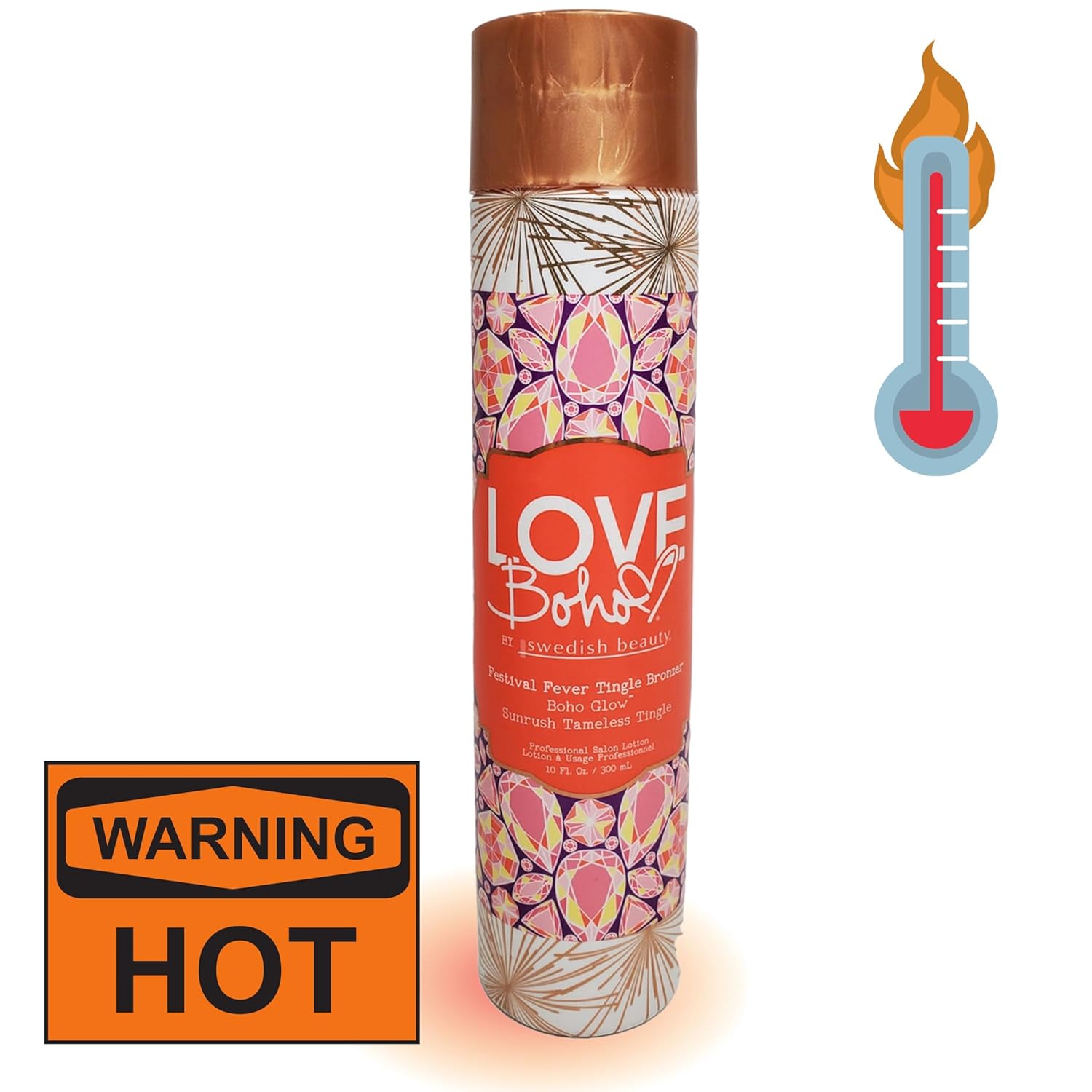 Swedish Beauty Love Boho Festival Fever Tingle Bronzer Tanning Lotion – 10 ounceLooking for the ultimate dark tan? Tingle tanning lotion is designed to break through your skin’s natural barriers, giving you an intense, deep tan like never before. Tingle lotions work by warming the skin, causing a tingling sensation as they stimulate blood flow and oxygenate skin cells, making tanning sessions shorter and more effective. Ingredients like benzyl nicotinate and essential oils create heat and redness during tanning, which fades to reveal a rich, dark glow. Tingle lotions are best for experienced tanners seeking extreme results, though fair-skinned individuals may find the sensation a bit intense. Enjoy a safe, ultra-dark tan and a truly unique tanning experience! This hot tingle bronzer is designed for experienced tanners, offering a bold, heated sensation to kickstart intense color development and leave you with a striking, sun-drenched glow. Features: