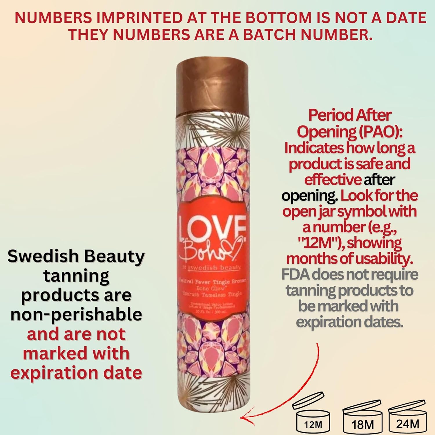 Swedish Beauty Love Boho Festival Fever Tingle Bronzer Tanning Lotion – 10 ounce, Blackberry Bellini Fragrance – Sparkling Berries, Sugared Violets and Crystalline Amber. Love Boho is a NON-PERISHABLE lotion it does not expire, it has a useful shelf life after opening.