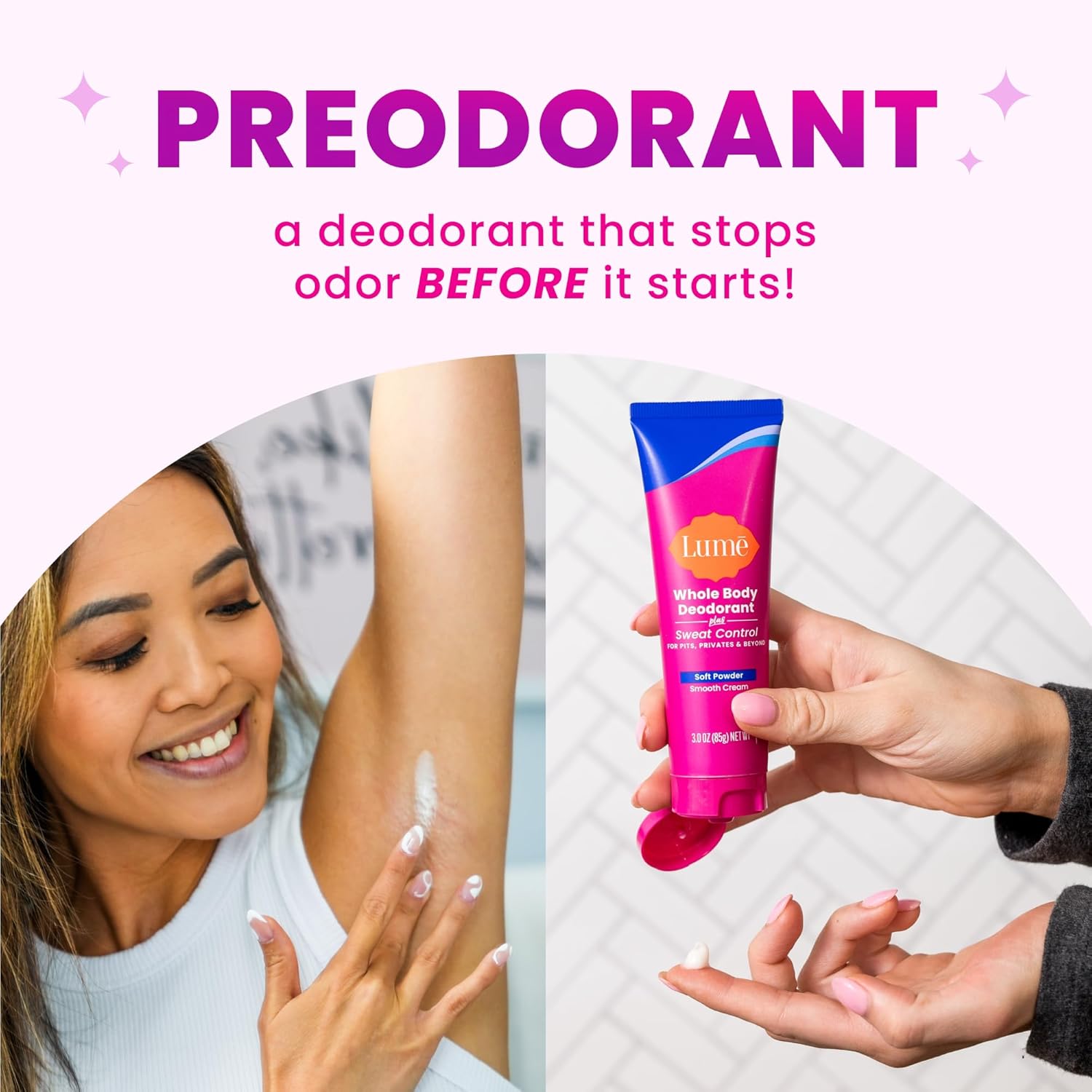 Lume is a Whole Body Deodorant for MORE than just your armpits–think pits, underboobs, belly buttons, butt cracks, vulvas, balls, feet, & more. Based in science, Lume stops odor BEFORE it starts. It is clinically proven to block body odor all day and continues to control B.O. for 72 hours.