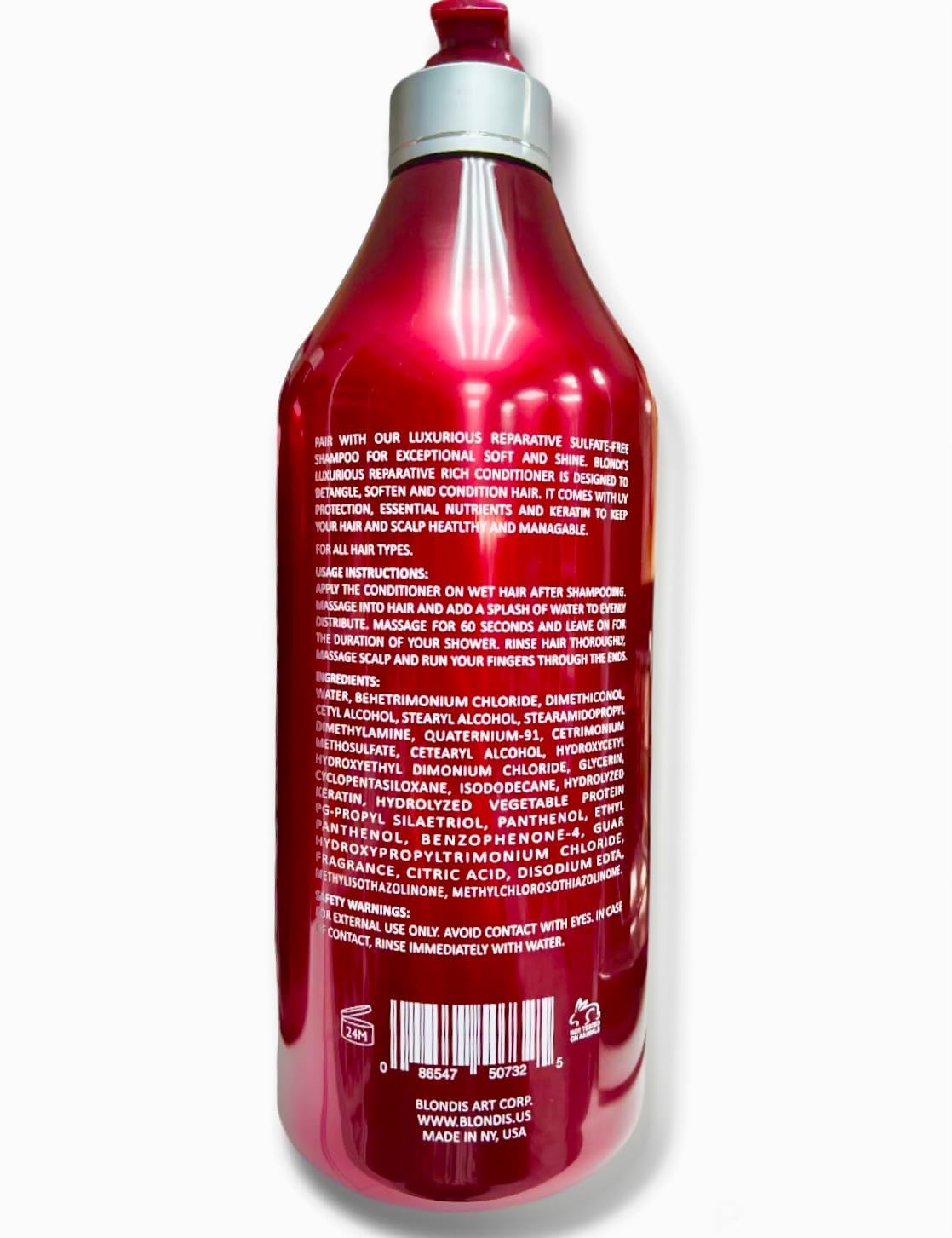 Blondis Luxurious Rich Conditioner is designed to detangle, soften, and condition hair in order to help it reach its full potential. It is infused with UV filters, essential nutrients, and proteins to help keep hair healthy and manageable. It has a longer lasting fragrance. For best results pair with Blondis Luxurious Sulfate-Free Shampoo. USAGE INSTRUCTION: Apply the conditioner in wet hair after shampooing, massage well into hair and add a splash of water to evenly distribute. Massage for 60 seconds and leave on for the duration of shower. Rinse hair thoroughly and run your fingers from scalp to end.