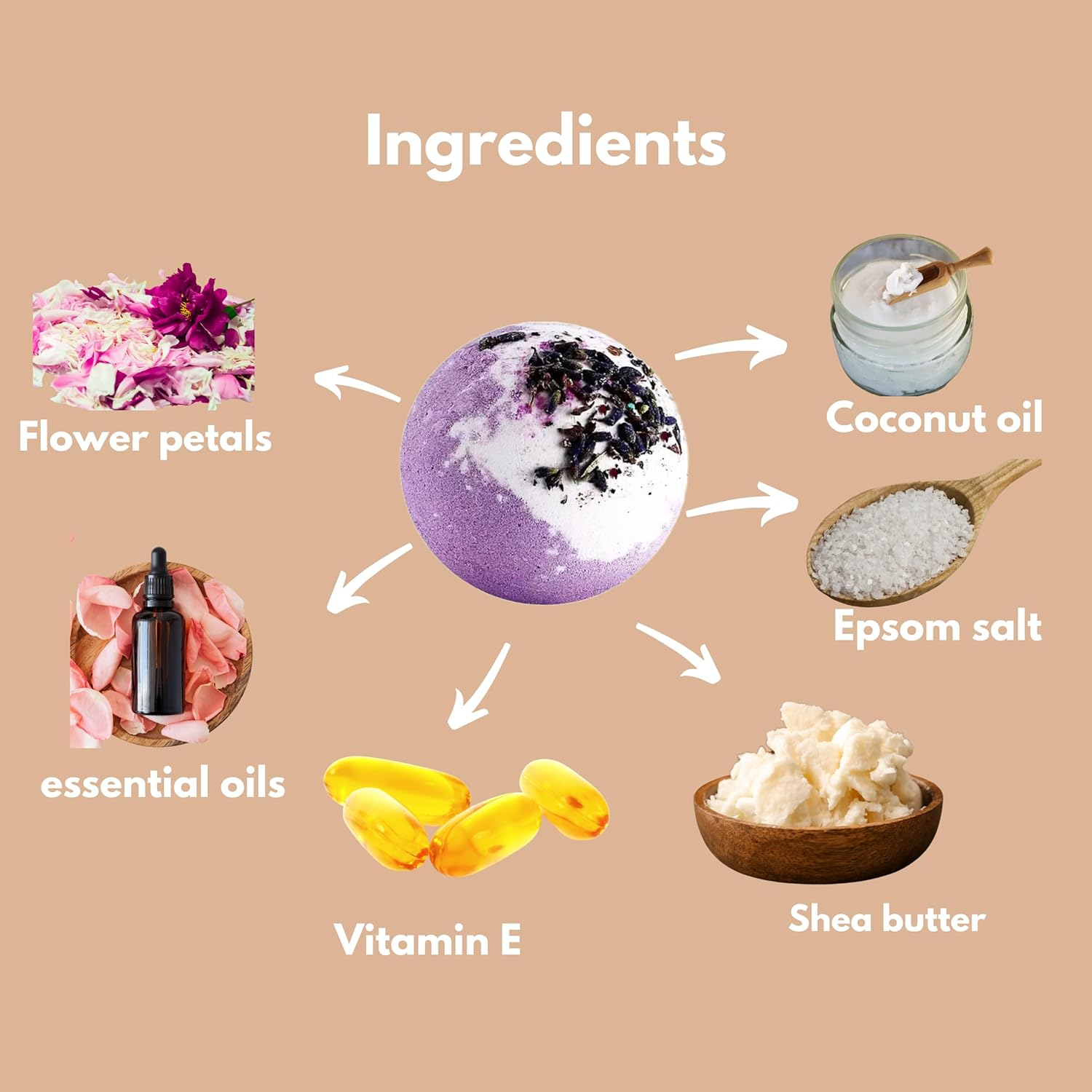 Long-lasting: Our large bathbombs are individually wrapped and packed air tight. They release therapeutic pure essential oils, relaxing fragrances that last long and stunning colors that does not stain your bathtub!