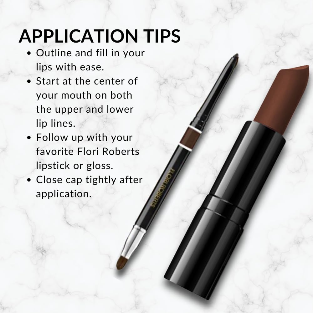 APPLICATION TIPS Outline and fill in lips, starting at the center of the mouth on both the upper and lower lip lines. Follow by applying your favorite Flori Roberts lipstick, gloss or wear alone. Close cap tightly after application.
