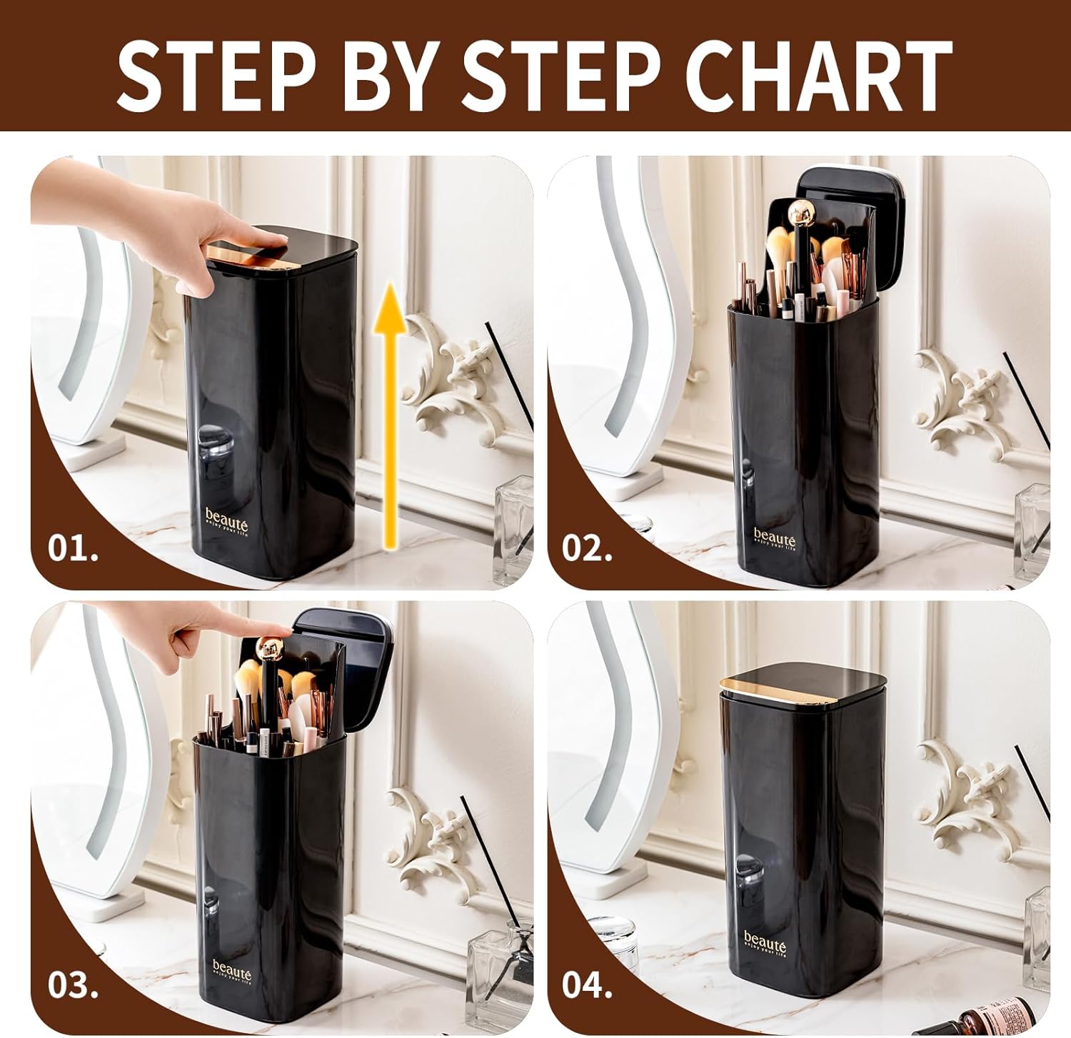 Makeup Brush Holder Organizer, One Touch for Open, Dustproof Make Up Organizer with Lid for Vanity Bathroom Countertop,Black