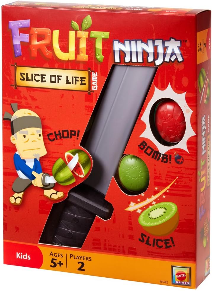 Fruit Ninja: Slice of Life Game – Based on the top-selling Apple iOS and Android app, the Fruit Ninja Slide of Life action game turns the fun of the digital app into fast and frenetic physical play. Both kids and adults alike love the app’s addictive action of chopping and slicing flying fruit while avoiding the bombs, and now they can do it for real on either the table top or the floor. With two toy ninja swords, 20 physical fruit and bomb pieces, and 40 Fruit Ninja mission cards, this exciting skill and action game allows players to race to physically slash and splatter fruit pieces like true ninja warriors. Fruit Ninja Slice of Life is a two-player game in which the object of the game is to be the first player to complete each fruit mission card and earn the accompanying points. The player with the most points wins and is dubbed the ultimate Fruit Ninja.