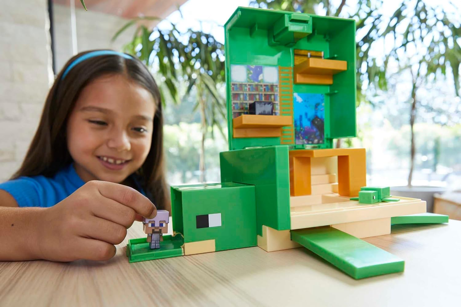 This giant-sized Minecraft Turtle transforms into a multi-level hideout and command base for Steve and his little Turtle friend (included). There are four action levels and a window with a changing ocean view. The giant Turtle’s mouth opens to revel a secret entrance. It’s endless fun for Minecraft video games as they act out aquatic adventures. Also stores extra figures (each sold separately). Colors and decorations may vary.
