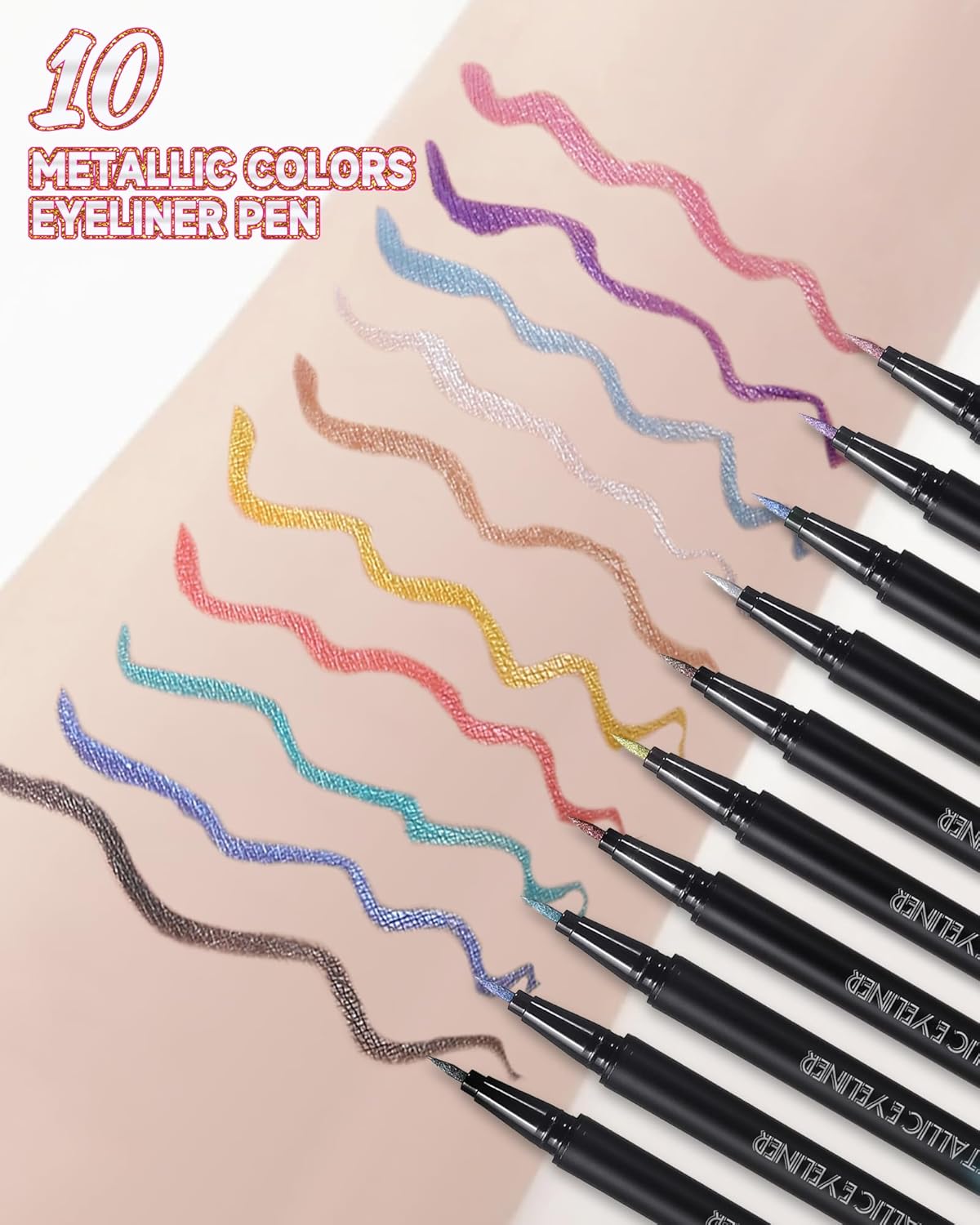 Diamond Glitter Liquid Eyeliner – This colorful metallic eyeliner comes in 10 different colors, from elegant pink to cool black, the intense metallic colors create different looks for you to enjoy the diamond sparkling eye makeup, making you the focus of the crowd.