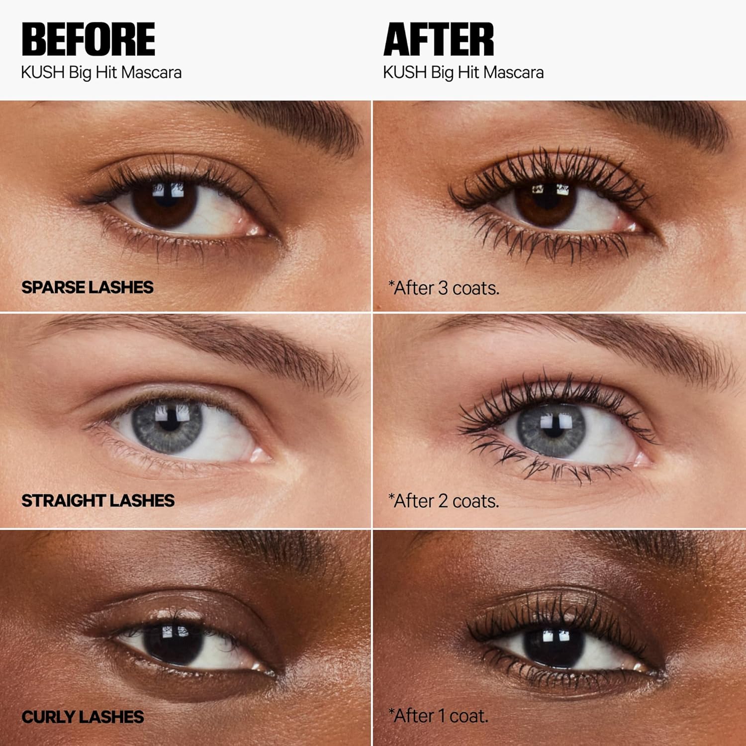 KUSH Big Hit Volumizing Mascara is our highest-volume mascara that doesn’t clump, smudge, or flake for up to 12 hours. Our water-resistant KUSH High Roll Tubing Mascara lengthens + defines lashes for up to 24 hours. Both are cruelty-free.