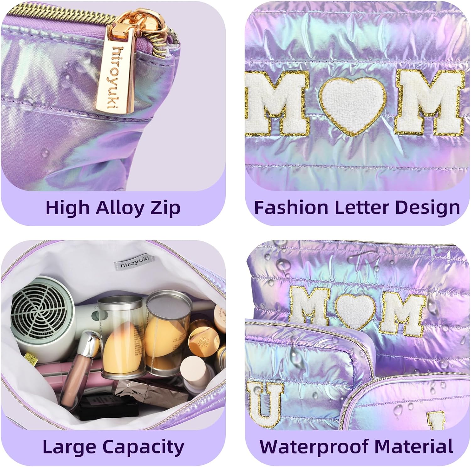 Premium Quality: This 3pcs makeup bags set features a luxurious quilted texture with shimmering metallic gold accents, The energetic colorful patterns are complemented by a heartfelt “I LOVE U MOM” print, making it a sentimental and stylish choice for Mothers Day Gifts.