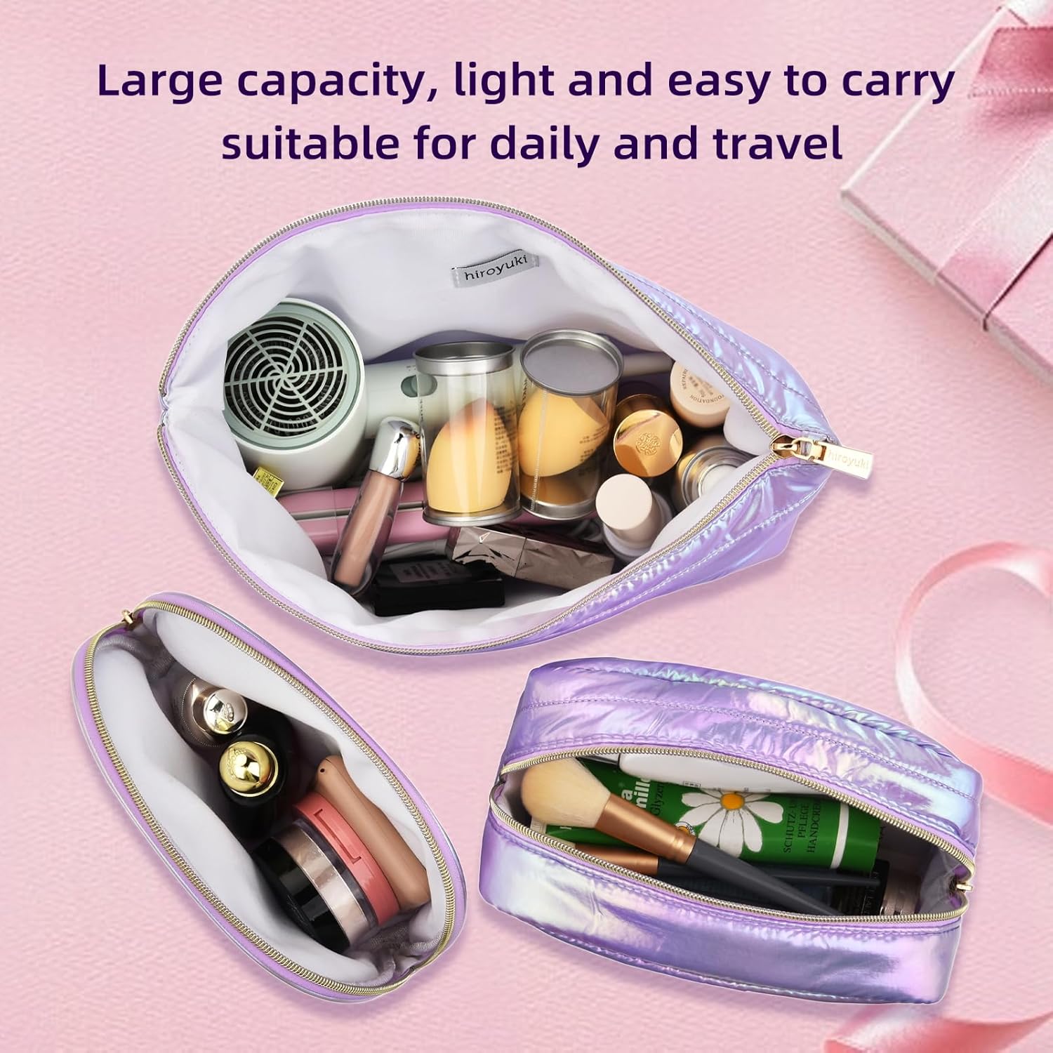 Different Sizes: The makeup bag set comes in three sizes. one large bag and two small bags. Large size: 14.5 x 9 inches, medium size: 8 x 6 inches, small size: 8.5 x 5.5 inches. The large bag is perfect for storing essential cosmetics and skincare products, while the two small bags are perfect for storing smaller items and can also be used as wallets.
