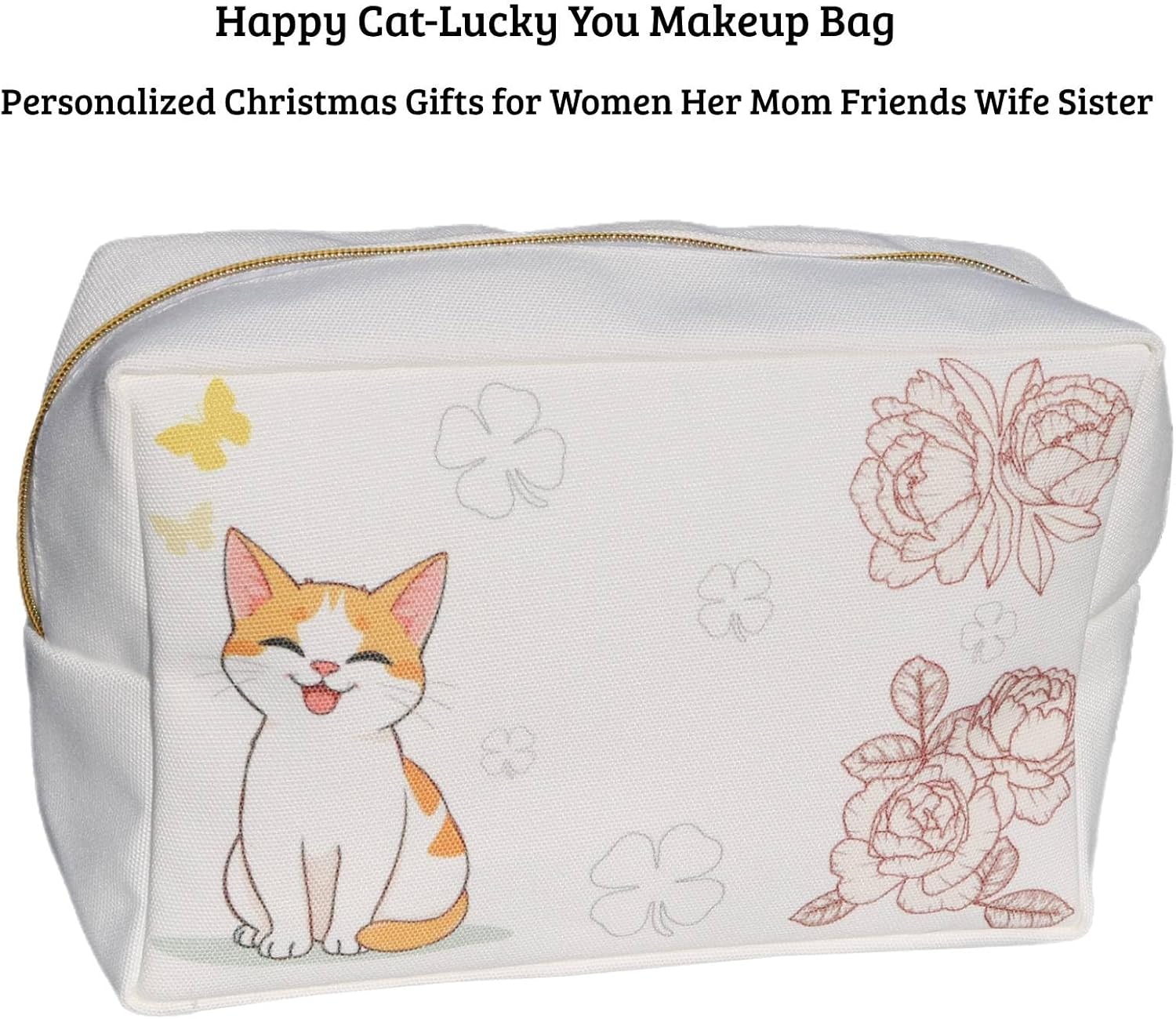 Artistic Design with Symbolic Details: Makeup bag Front: Lucky clover-surrounded smiling cat in trending luxury style aesthetic. Back: Vibrant butterfly pattern symbolizing transformation. Neutral base color complements any decor style.