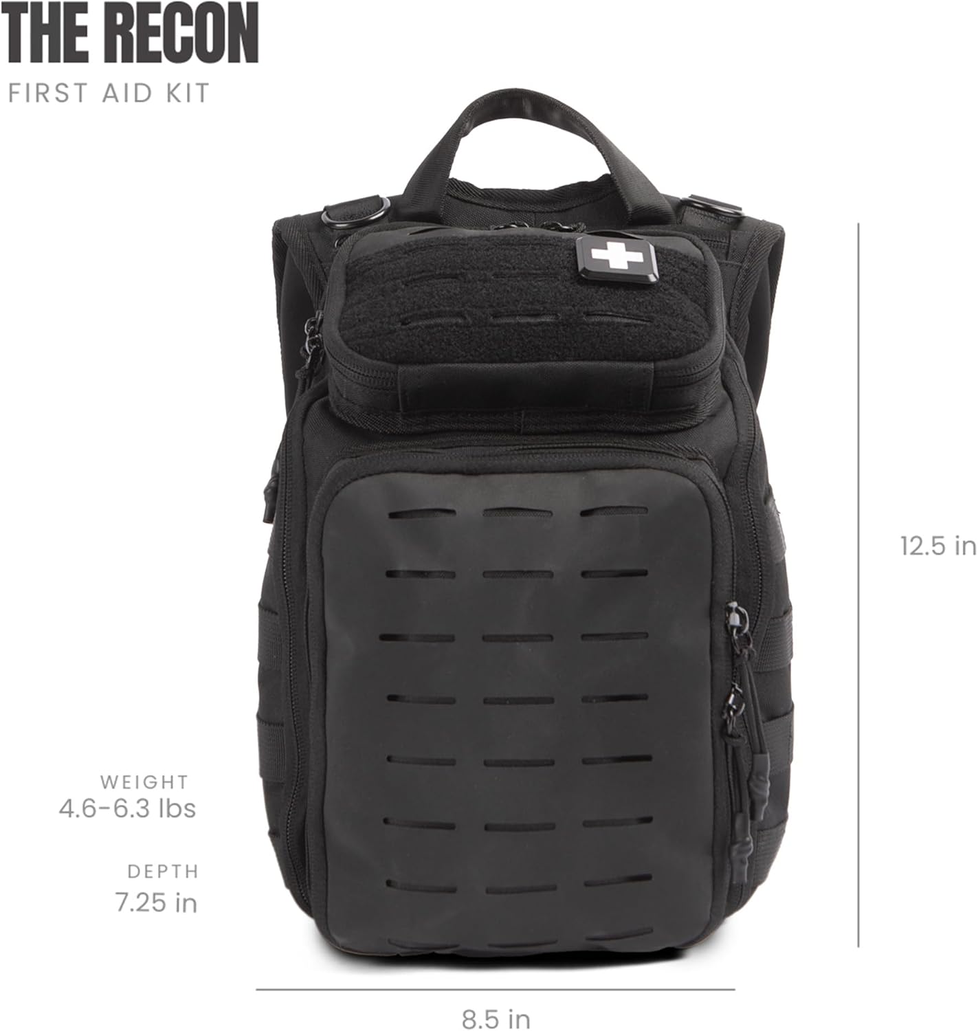 DESCRIPTION: The Recon is the just right size to keep you protected wherever you roam with over 250 life-saving accessories inside. Our features include new back padding for comfort and function, stowable shoulder straps with seatbelt style webbing for various storage capabilities, quick access front pockets for trauma and everyday use items, and a fully modular, lay flat organization system with interior mesh pockets, and much more. Experience first aid elevated! VERSATILE: The Recon is suitable for businesses, homesteading farms, students, law enforcement, teachers, parents, grandparents, essentially all adults, even doomsday preppers. From the beach, to camp, to home or anywhere in-between we have you covered with all the prime life saving aids and gadgets you could need in an emergency. SO MANY MODS: Each med pack contains several packages for various needs. Take The Recon every where you go from work to play, night or day. BLEED MOD: Container packing three various Superskin bandage packets, liquid bandage and two gauze mods. BURN MOD: MEDICATION MOD: Contains several different medicines for any use. SPORT MOD: Space blankets and blister strips. TOPICAL MOD: Antiseptic Wipes, Hand Sanitizer, Iodine Prep Pad, Triple Antibiotic Ointment, lip balm, sunscreen, Sting Relief Wipe, White Petrolatum, Hydrocortisone Cream, Oral Pain Relief, Ammonia Towelette, & Friction Frosting. AIRWAY MOD: CPR Shield a mask to prevent disease transmission during CPR. HYDRATION MOD: Hydration Packets & Water Purification Tablets SPRAIN & FRACTURE MOD: Finger Splint, 2″ x 15′ Sensi Wrap, Triangular Bandage, 2″ x 15′ Elastic Bandage & instant cold packs. TOOLS & DEVICES: Penlight, Tweezers, Thermometer, Thermometer Sheaths, Whistle, large EMT shears, & 1″ x 30′ adhesive cloth tape.