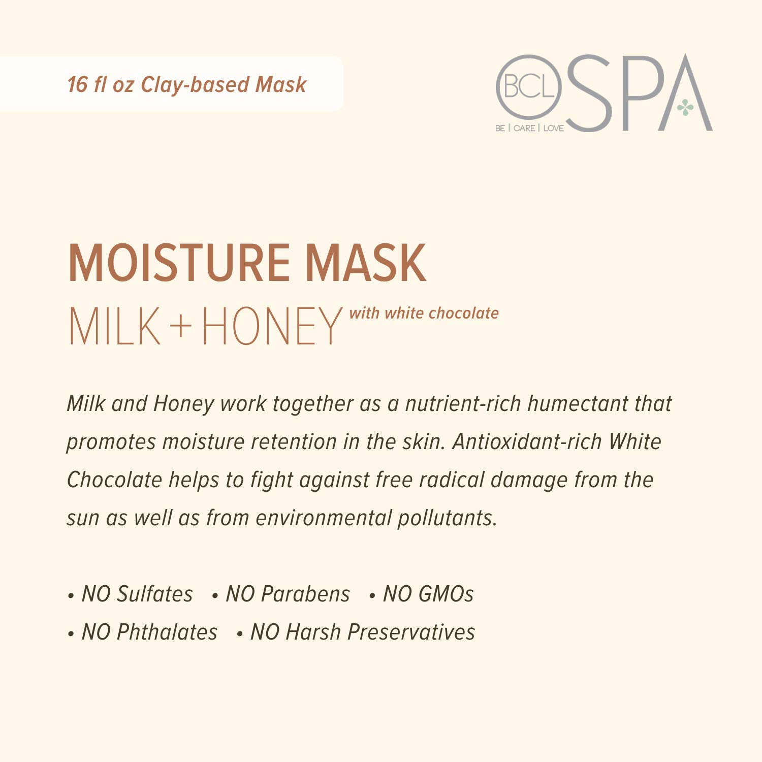 Generously apply BCL SPA Moisture Mask Milk + Honey with white chocolate to your hands and cover with a warm towel, damp sea kelp strips, or heated body wrap for best results. Let sit for fifteen minutes. Rinse thoroughly and pat dry.