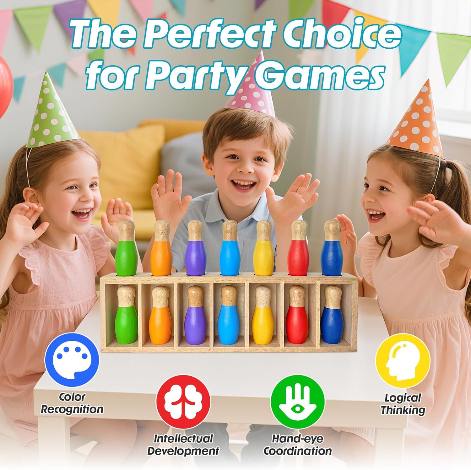 Bowling Pin Color Match Challenge: An engaging two-player game where one person secretly arranges the 7 colored wooden pins inside the beechwood box and gives color clues, while the other player matches the corresponding pins outside the box—without peeking! Includes 14 vibrant bowling pins (7 pairs) and a storage bag. Perfect for family game nights, playdates, or classroom activities.