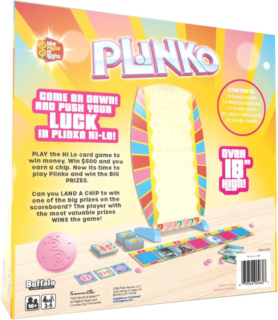 Play The Price Is Rights most popular board game at home! Come on down and compete with other contestants in the game you always dreamed of playing. Earn Plinko chips by playing Hi Lo. Then take turns stepping up to the official Plinko board and dropping your chips to score. Where will your chip land? The player who wins the most valuable prizes, wins the game! The board stands 18” tall and includes 7 Plinko Chips, 1 Gameboard, 37 Luxury Prize Cards and 98 Money cards.