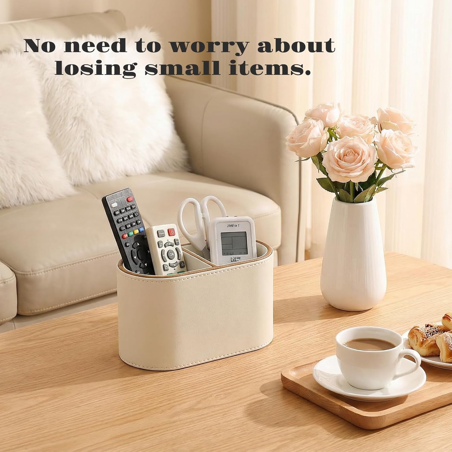 Materials: thick PU leather exterior and soft velvet interiorColor: white and khakiProduct Size: 6.3 ” L x 3.2 ” W x 4 ” H, two segmented sections in this remote control holder allow smart sorting of different toolsEasy to Clean: just wipe with a wet wipe