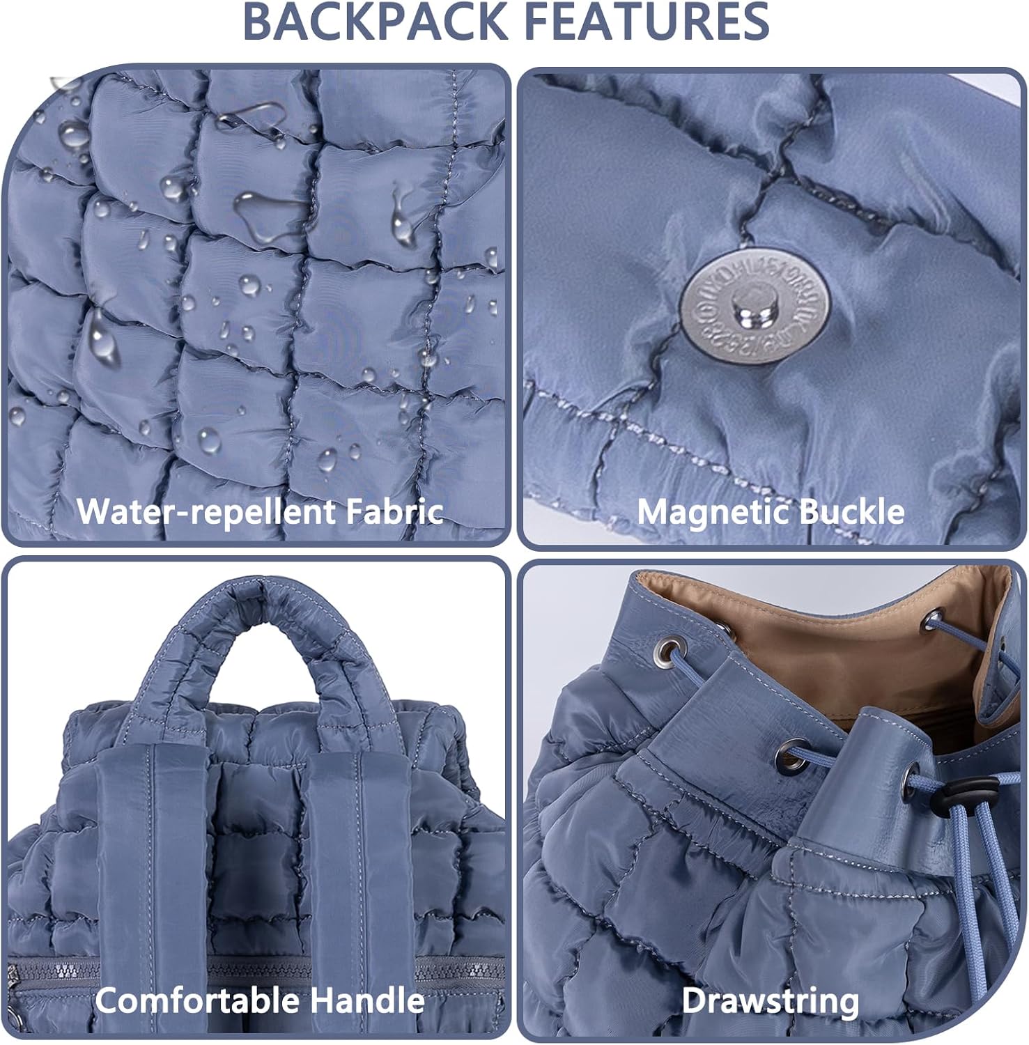 Quilted Puffer Backpack for Women: Large Lightweight Soft Purse Backpacks for Travel Daypack Hiking Gym School College – Cute Trendy Luxury Drawstring Laptop Backpack (Light Blue)