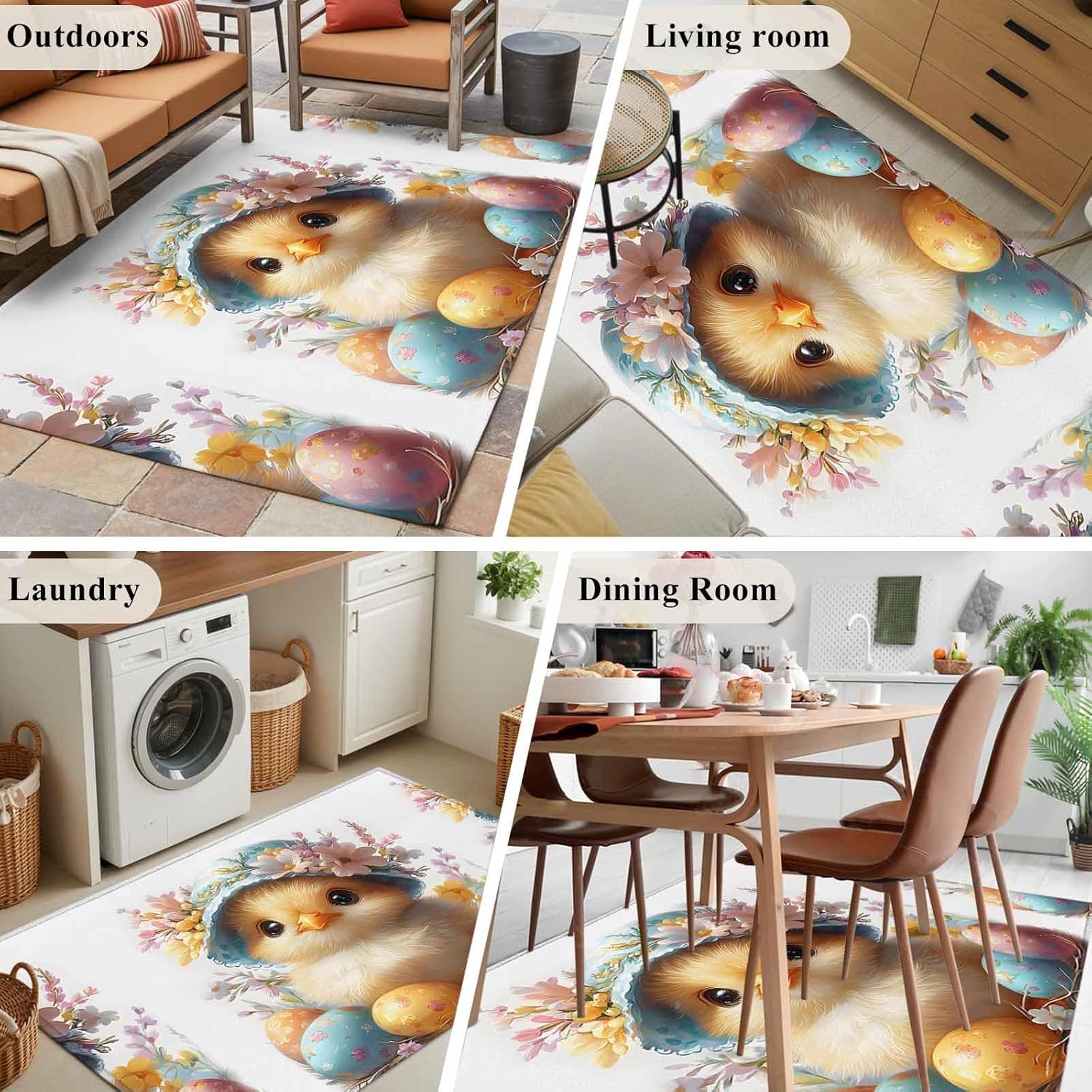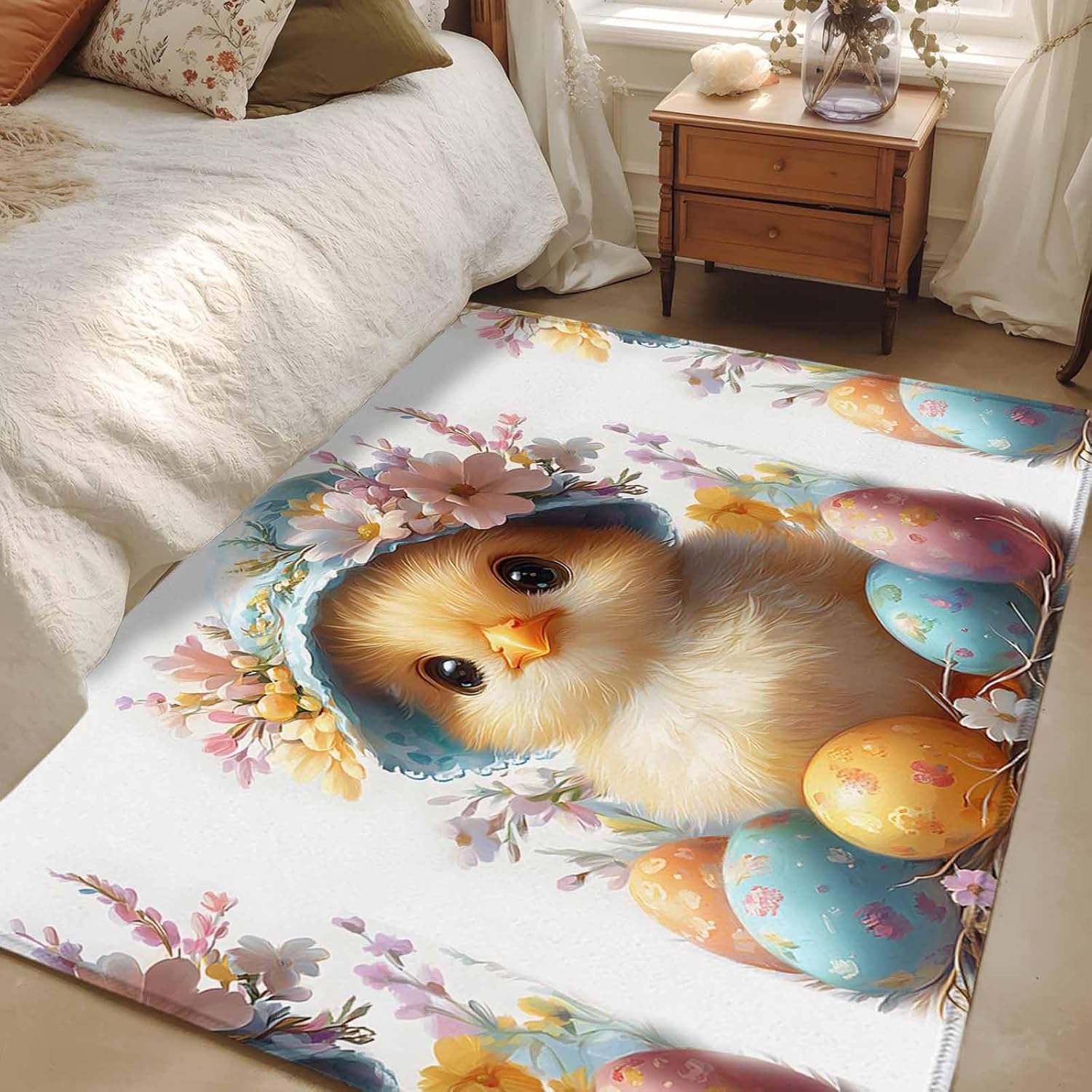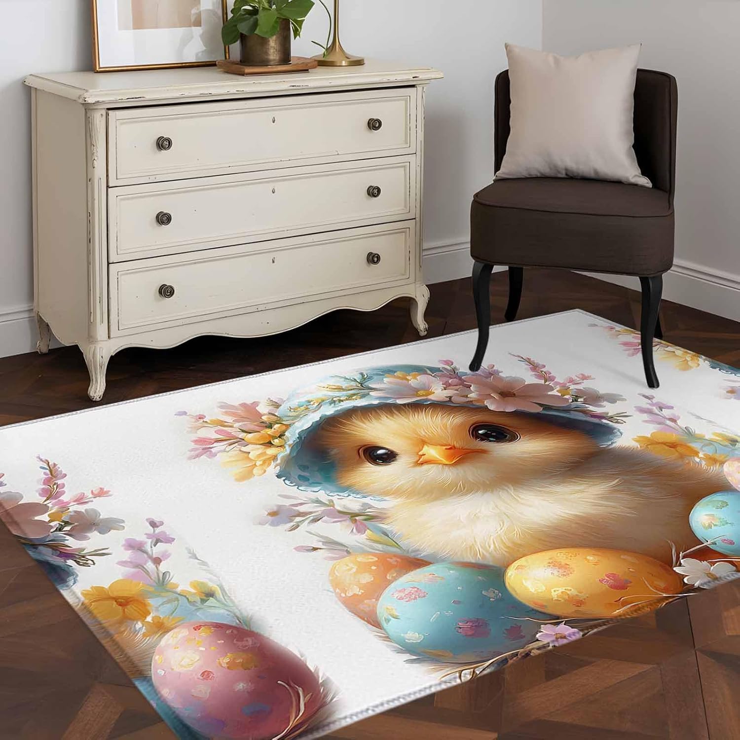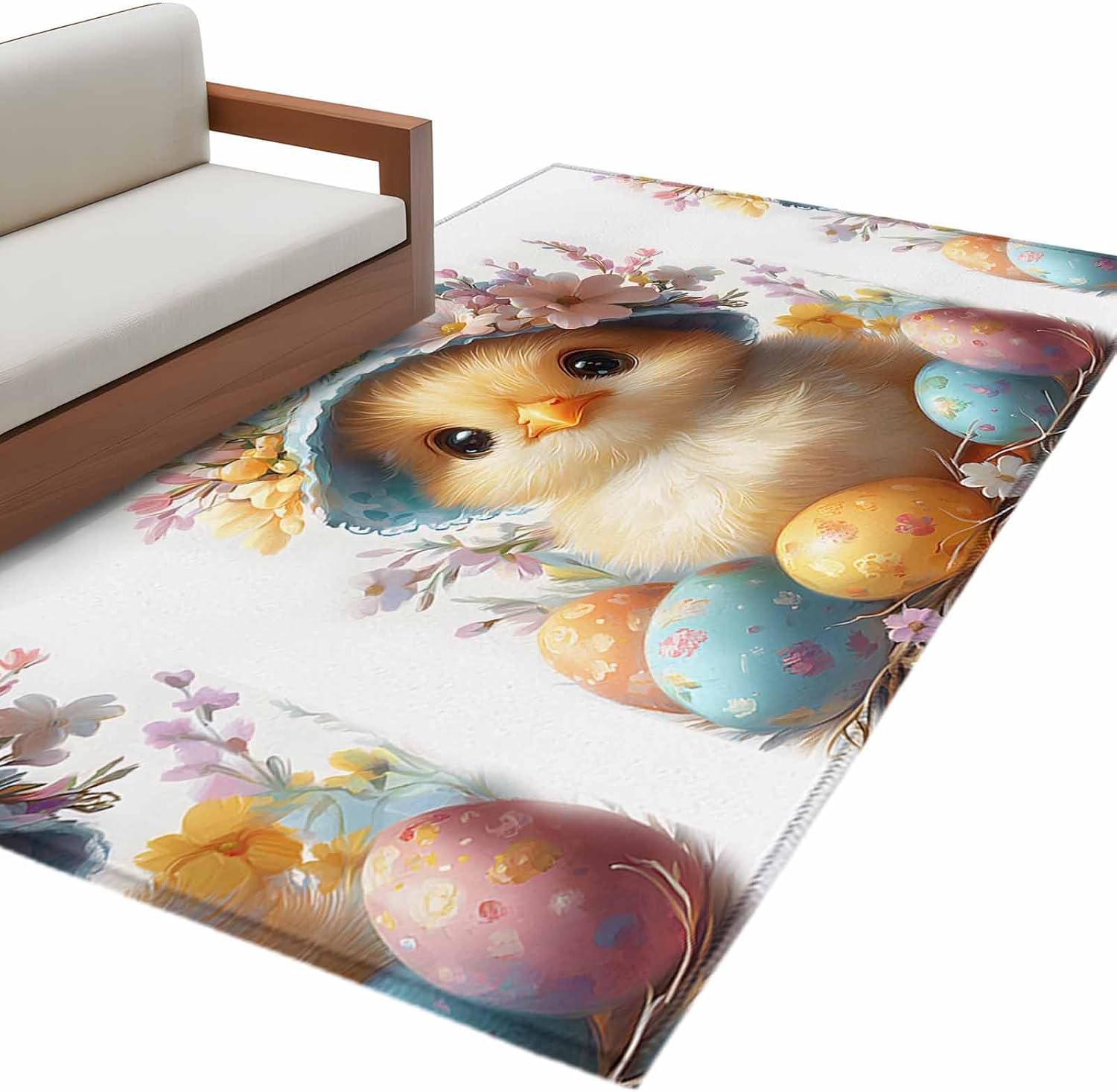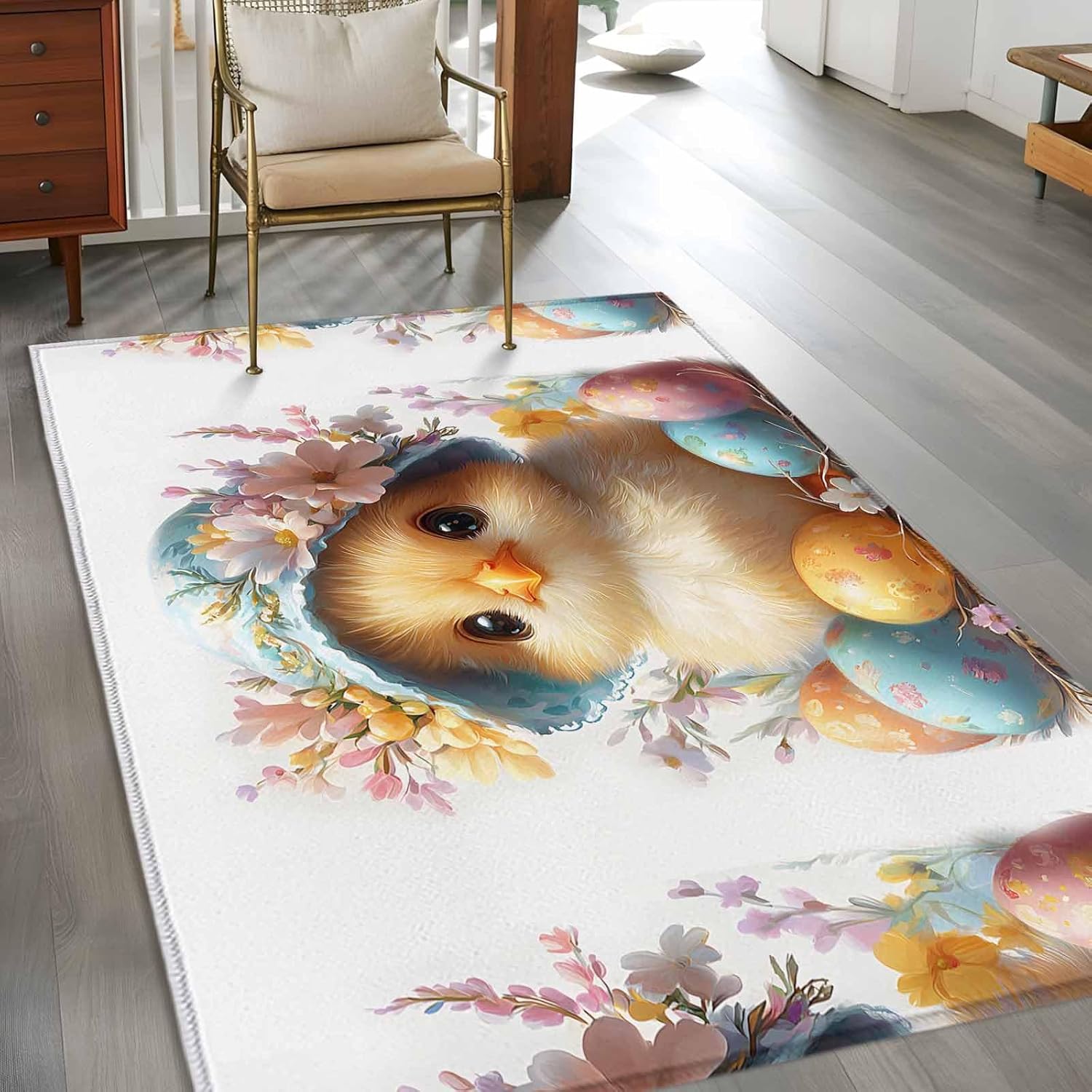 Rectangle Area Rug 3x5ft, Watercolor Chicken Easter Egg Flower Non-Slip Non-Shedding Floor Mat, Cartoon Spring Washable Sturdy Carpet for Living Room Bedroom Home Decor