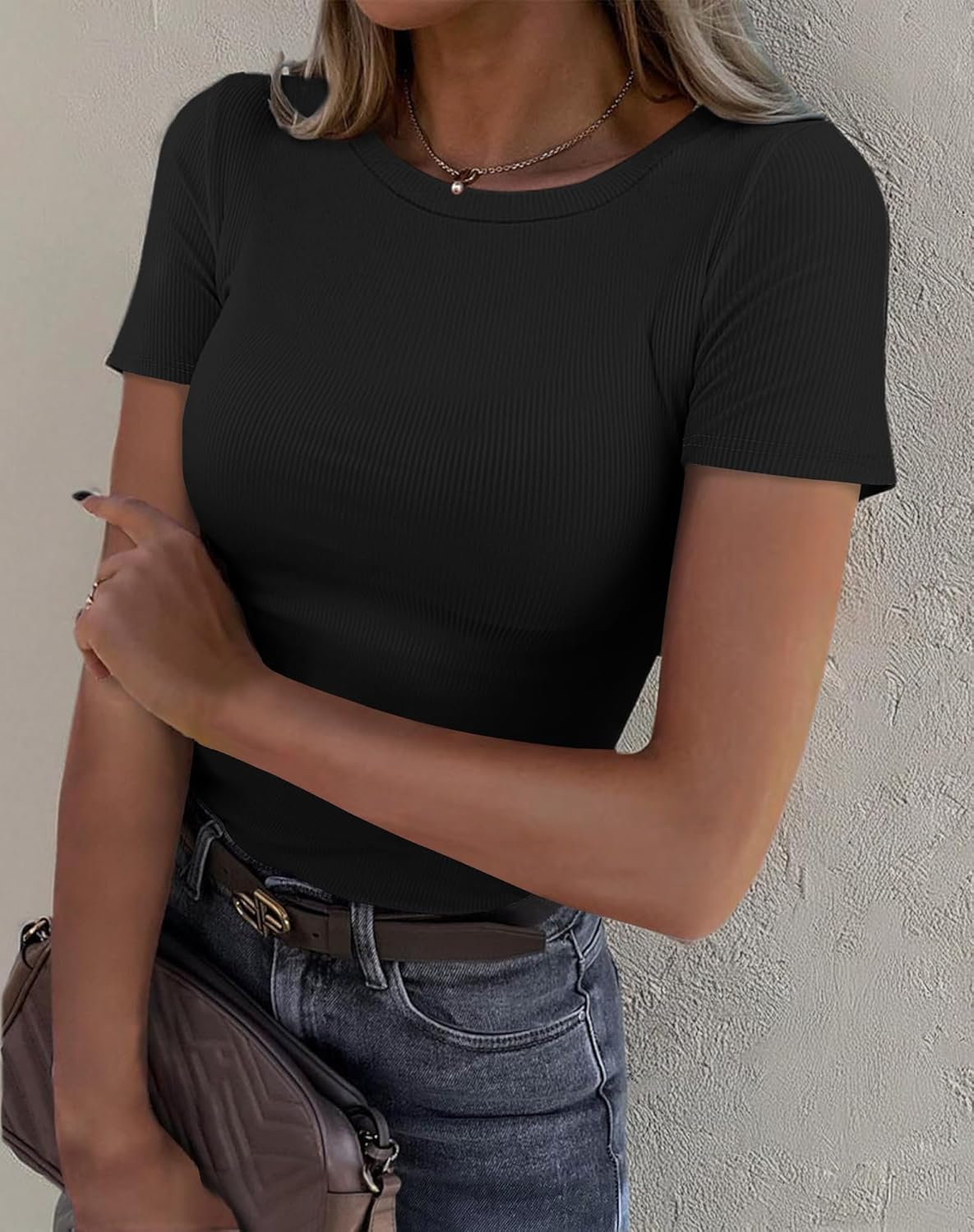 Fitted Shirt Clings To Body, Showing Your Body Curve Perfectly.Pull on closure, Crew Neck, Short Sleeve, Multi Color Option, Knit Tee Shirt Tops. A must have basic all season layering T shirt tops.This short sleeve top made from premium breathable, lightweight ribbed fabric, giving it elasticity, while remaining soft and silky to the touch as it contours to your shape.Easy match with jeans, legging or wear under jacket outwear. A nice choice for business, work office, going out, vacation, beach, party, club and daily wear etc.