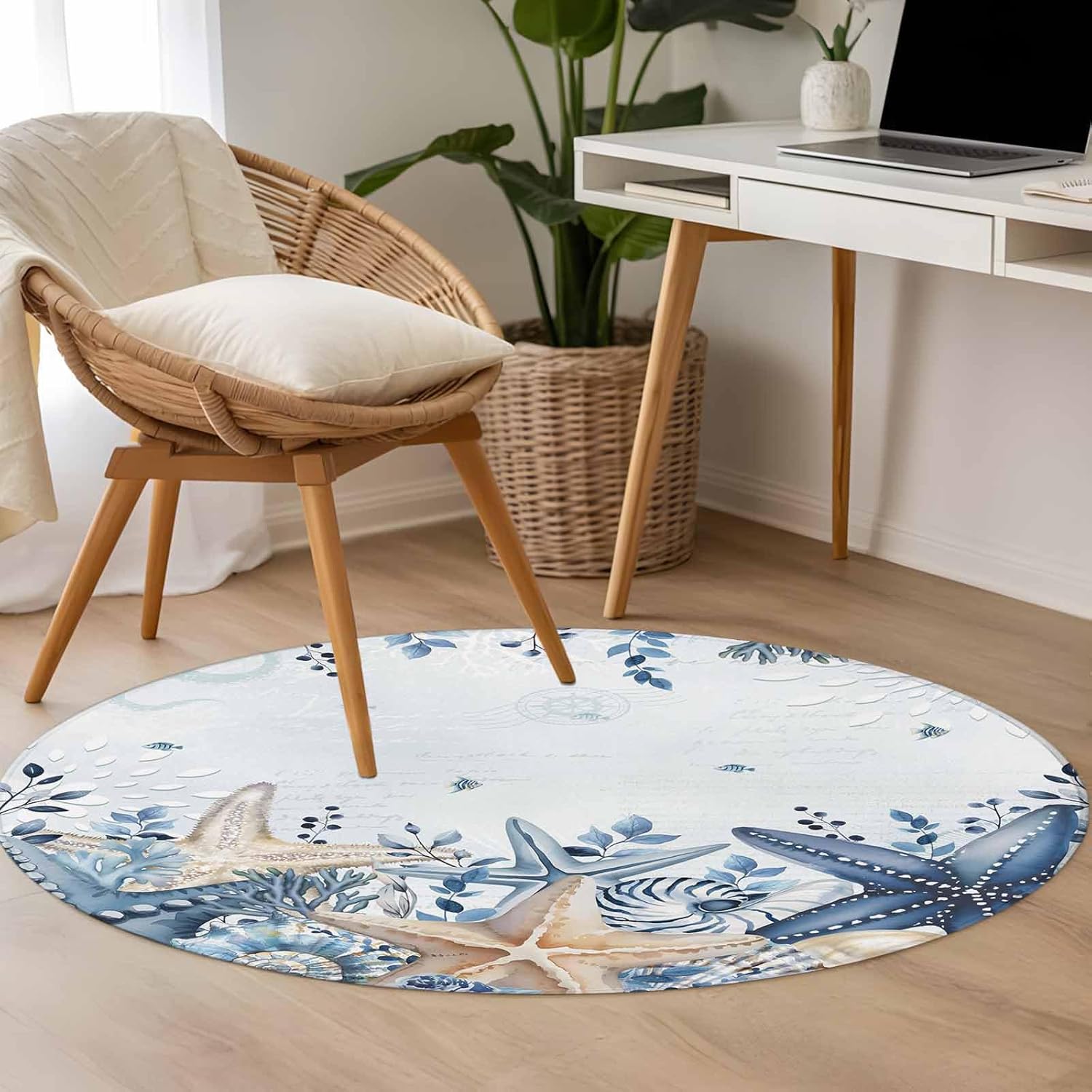 Round Rugs 4Ft, Blue Starfish Coastal Washable Rug for Living Room Low Pile Indoor Floor Carpet, Eucalyptus Summer Nautical Shell Non-Skid Bathroom Rug Kitchen Runner Rugs for Bedroom