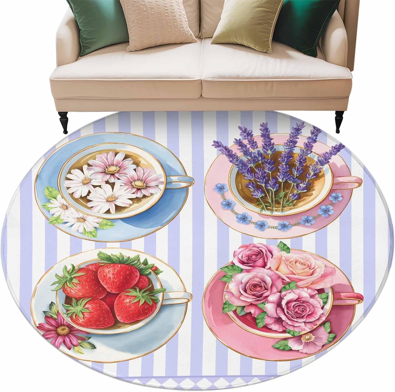 Round Rugs 7Ft, Spring Flowers Washable Rug for Living Room Low Pile Indoor Floor Carpet, Daisy Rose Lavender Strawberries Blue Stripes Non-Skid Bathroom Rug Kitchen Runner Rugs for Bedroom