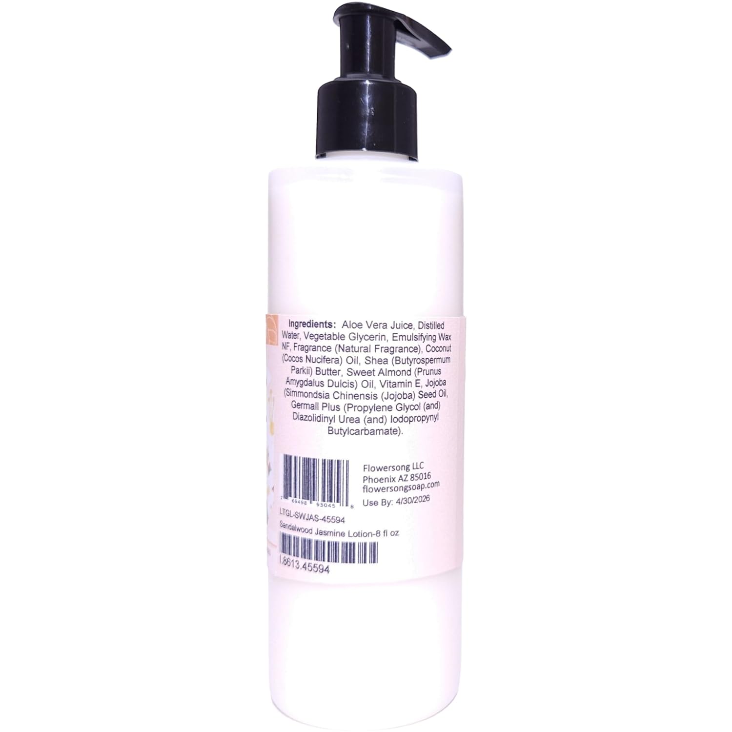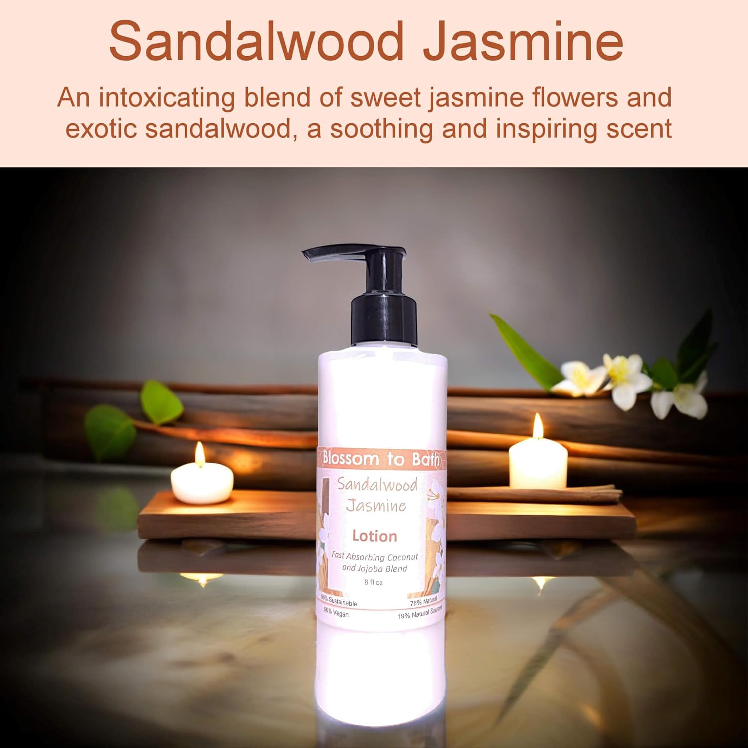 Daily Use Lotion with a Luxury Warm Woody Scent that Soaks in Quickly to Soften and Smooth Skin : Give your skin a warm woody scented drink of aloe and jojoba. Hydrate skin with coconut oil and shea butter plus a stirring earthy floral scent to hydrate, soften and refresh skin. This daily lotion formula contains oodles of aloe juice and glycerin to attract moisture to skin all day. Love the skin you are in and enjoy the fragrance every day. Warm Woody Scented All Day Moisture : Pamper your skin daily with Sandalwood Jasmine Lotion, featuring natural moisturizers like coconut oil and jojoba. This fast-absorbing formula hydrates and softens skin without greasiness, while aloe juice and shea butter provide long-lasting moisture. Perfect for smooth, refreshed skin every day. Light but lasting, finally a non-greasy lotion that creates irresistible softness all day. A treat for thirsty skin, this fast absorbing lotion is a fantastic softener and moisturizer, giving your skin the nature and nurture it needs. Stirring Earthy Floral : Sandalwood Jasmine is an enchanting blend of floral and earthy notes. The exotic sweetness of jasmine blossoms contrasts beautifully with the warm, woody depth of sandalwood. This soul-stirring fragrance achieves the perfect balance of femininity and masculinity, evoking a sense of serene luxury.
