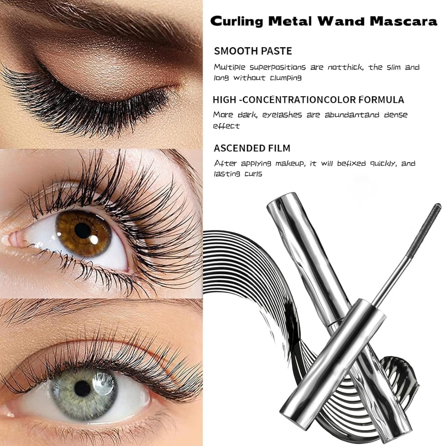 Instant Lash Curling with Metal Wand Metal curling mascara, achieve dramatic, eye-opening curls effortlessly. The iron-infused metal brush lifts and separates each lash for a wide-awake look—no eyelash curler needed!