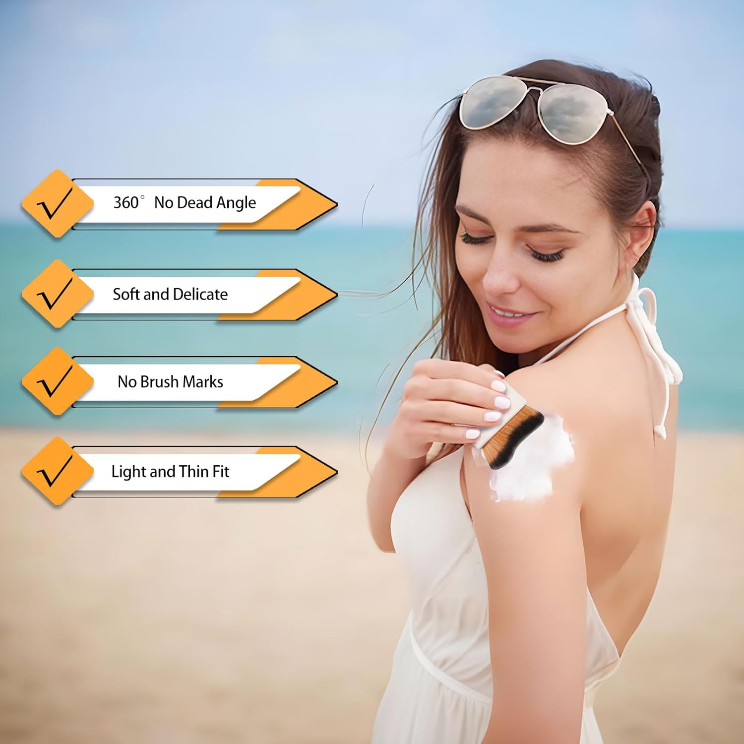 2. The brush can be used with different types of body makeup, including liquid foundation, sunscreen, self-tanner, sunless tan, tanning mousse, tanning lotion, bronzer, and body lava.