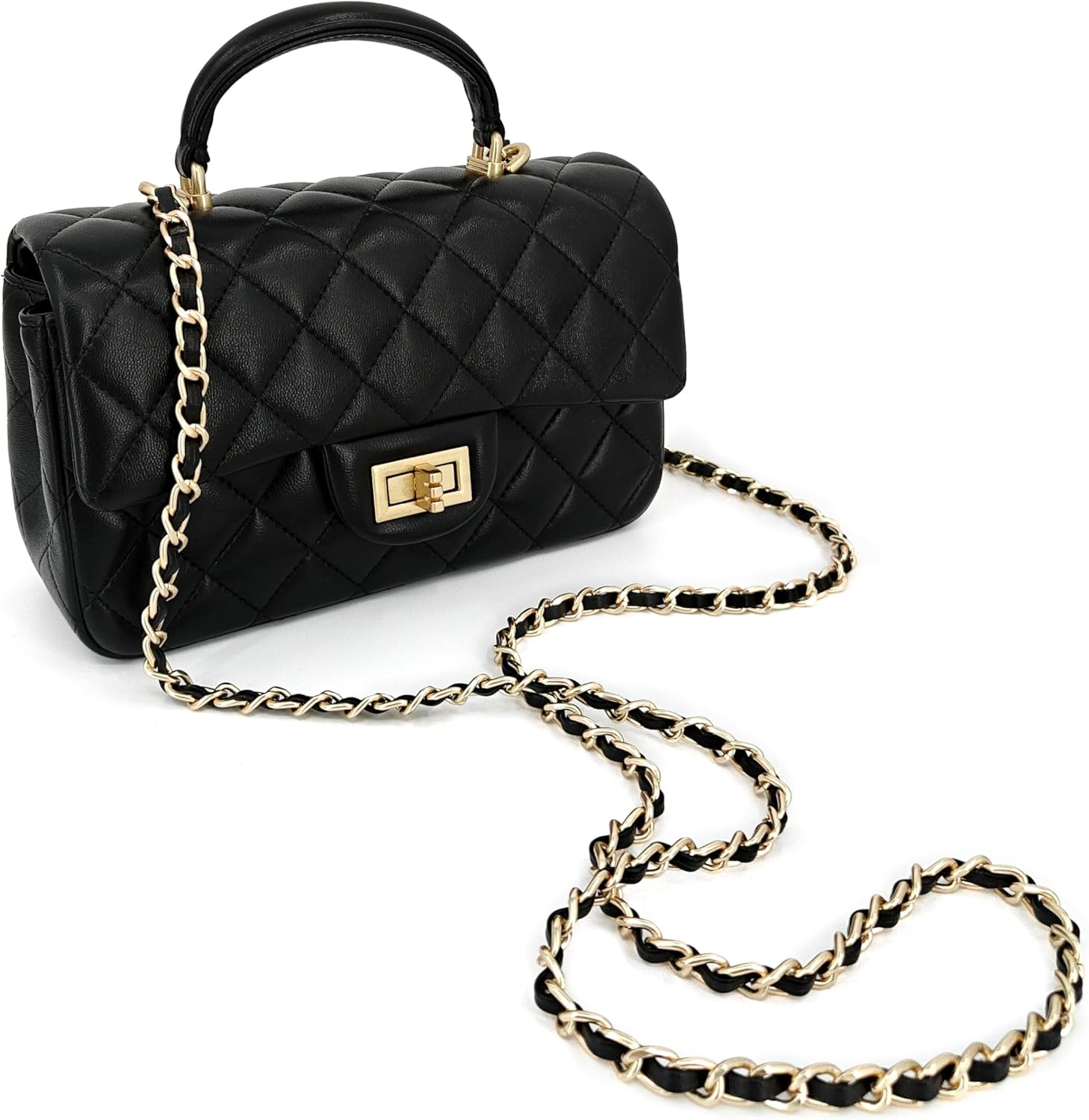 Small Quilted Crossbody Bags for Women, Genuine Leather Shoulder Bag w/Gold Chain Strap, Soft Mini Top Handle Flap Purse