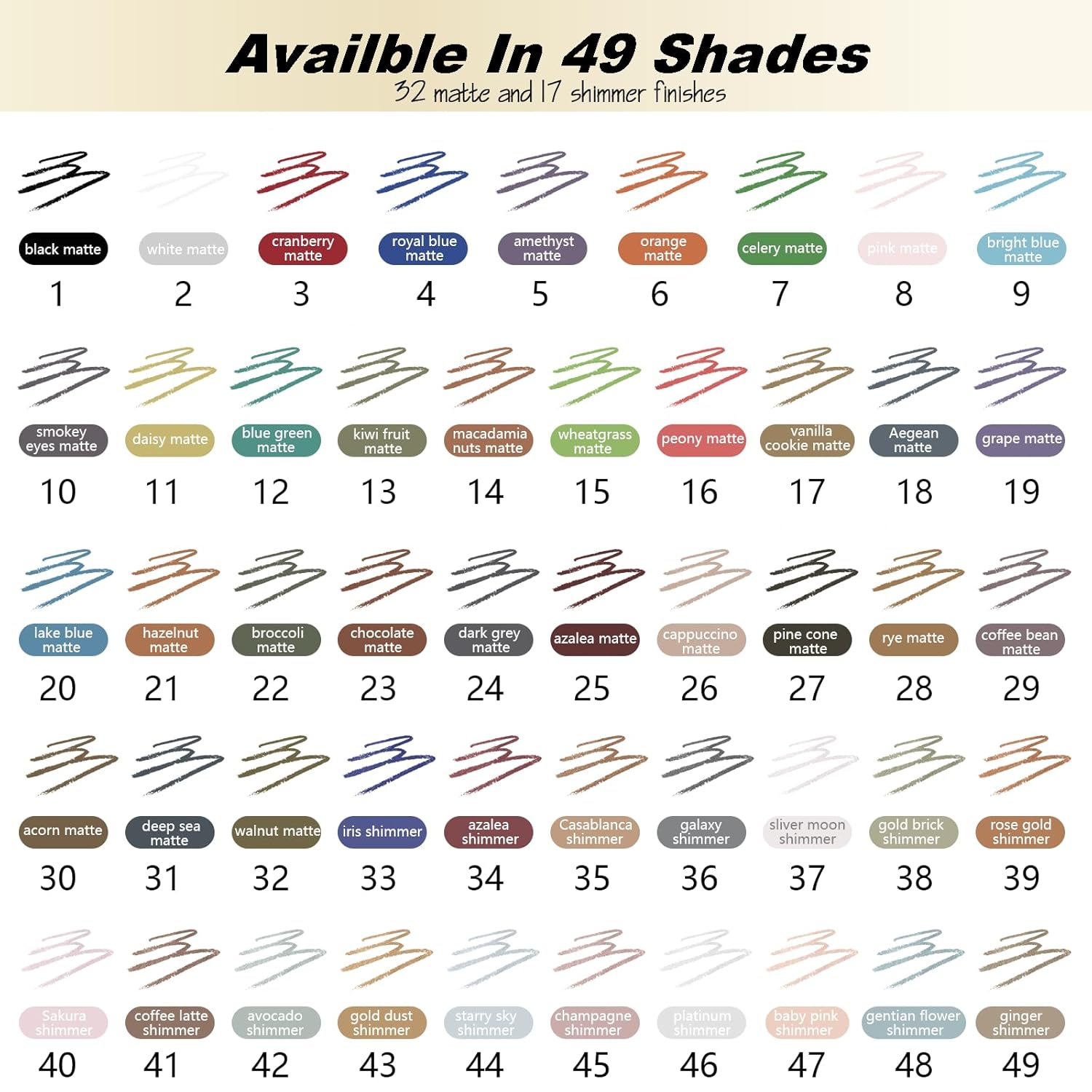 Matte and Shimmer Eyeliner: There are 32 matte gel eyeliners and 17 shimmer smudge proof eyeliners to choose from, rich in color and smooth to apply, from natural daily makeup to charming stage makeup, it can meet all your requirements for eyeliner.