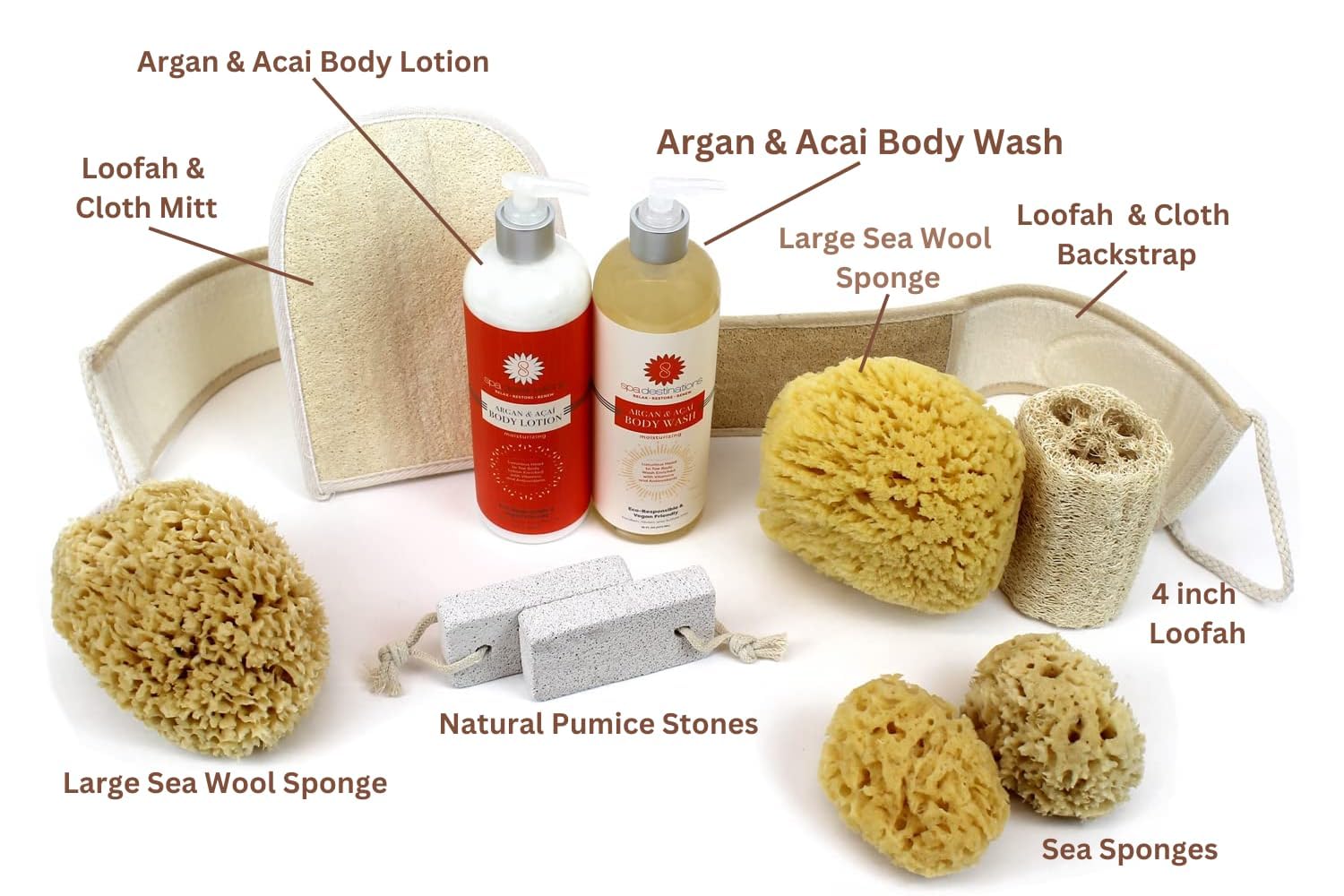 Spa Gift Set for Women. “Ultimate Bath & Shower Experience” 11-piece Tropical Scent Gift Set with Body Wash, Body Lotion and Natural Sponges, Loofahs and Pumice $110 Value