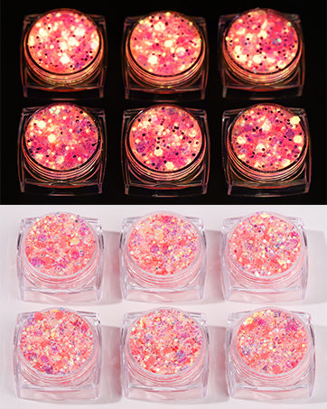 These glitters are capable of charging under a lamp or in sunlight, but charge much slower than a UV blacklight.