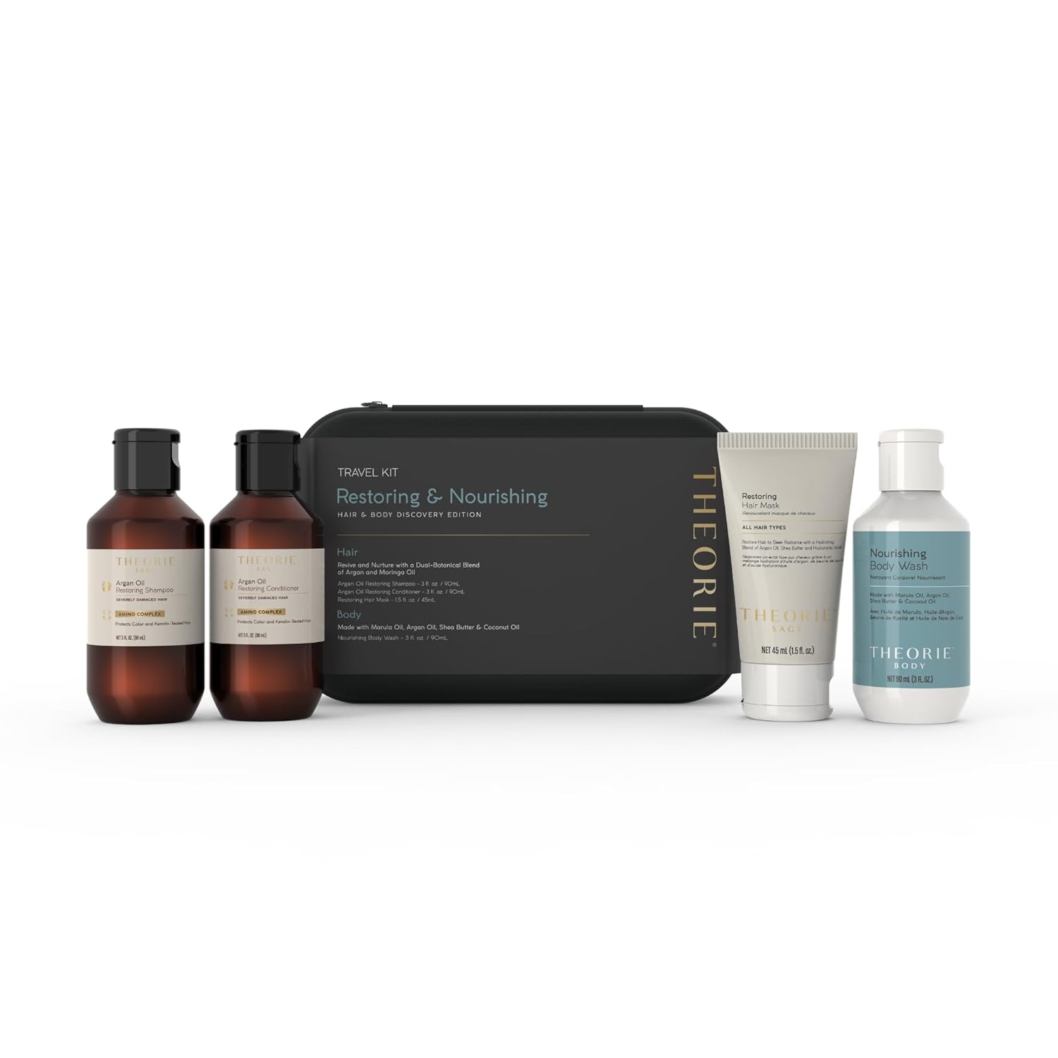 Elevate your travel routine with THEORIE’s Restoring & Nourishing Travel Kit, a luxurious four-piece collection designed for both hair and body care. This TSA-approved set features salon-grade formulations enriched with premium ingredients including argan oil, hyaluronic acid, and shea butter. The collection includes a nourishing shampoo, revitalizing conditioner, intensive hair mask, and indulgent body wash, all infused with a captivating Mediterranean-inspired fragrance of jasmine, rhubarb, and green tea. Perfect for all hair types including dry, color-treated, and damaged hair, these sulfate-free, paraben-free formulations deliver professional-quality care wherever your journey takes you. Each product works in harmony to restore softness, strengthen strands, and maintain healthy-looking hair and skin. The travel-sized portions ensure you never have to compromise on your self-care routine, even when you’re away from home.