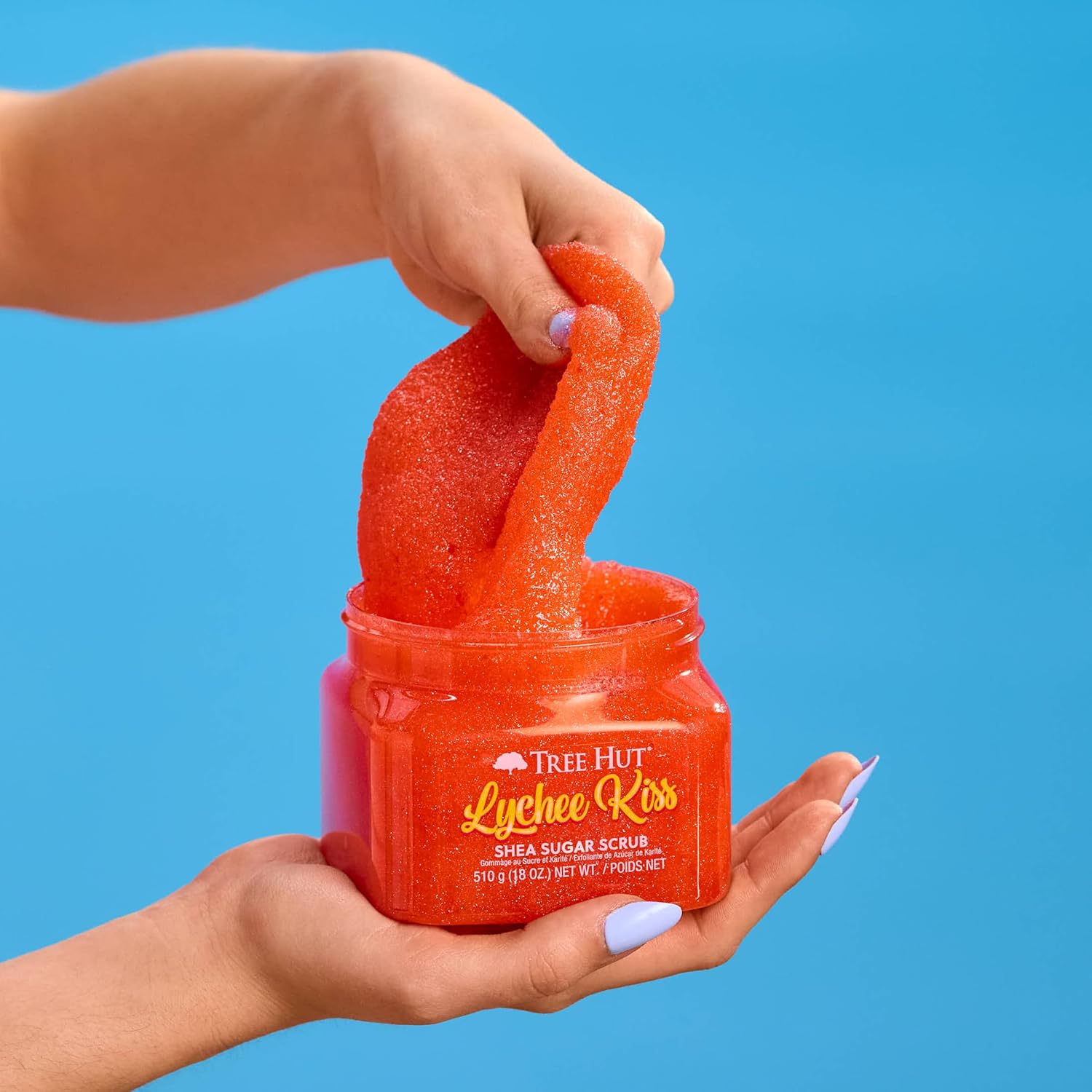 Reveal youthful, vibrant skin with the exotic, lush scent of Lychee Kiss! Made with Sugar, Shea Butter, Lychee Extract and Mandarin Extract to leave skin feeling nourished and smelling delicious. Tree Hut Sugar Scrubs remove dull, dead skin with gentle exfoliation and are paraben-free, vegan, sulfate-free, contain no formaldehyde donors, and have a no-slip formula with a long-lasting fragrance.