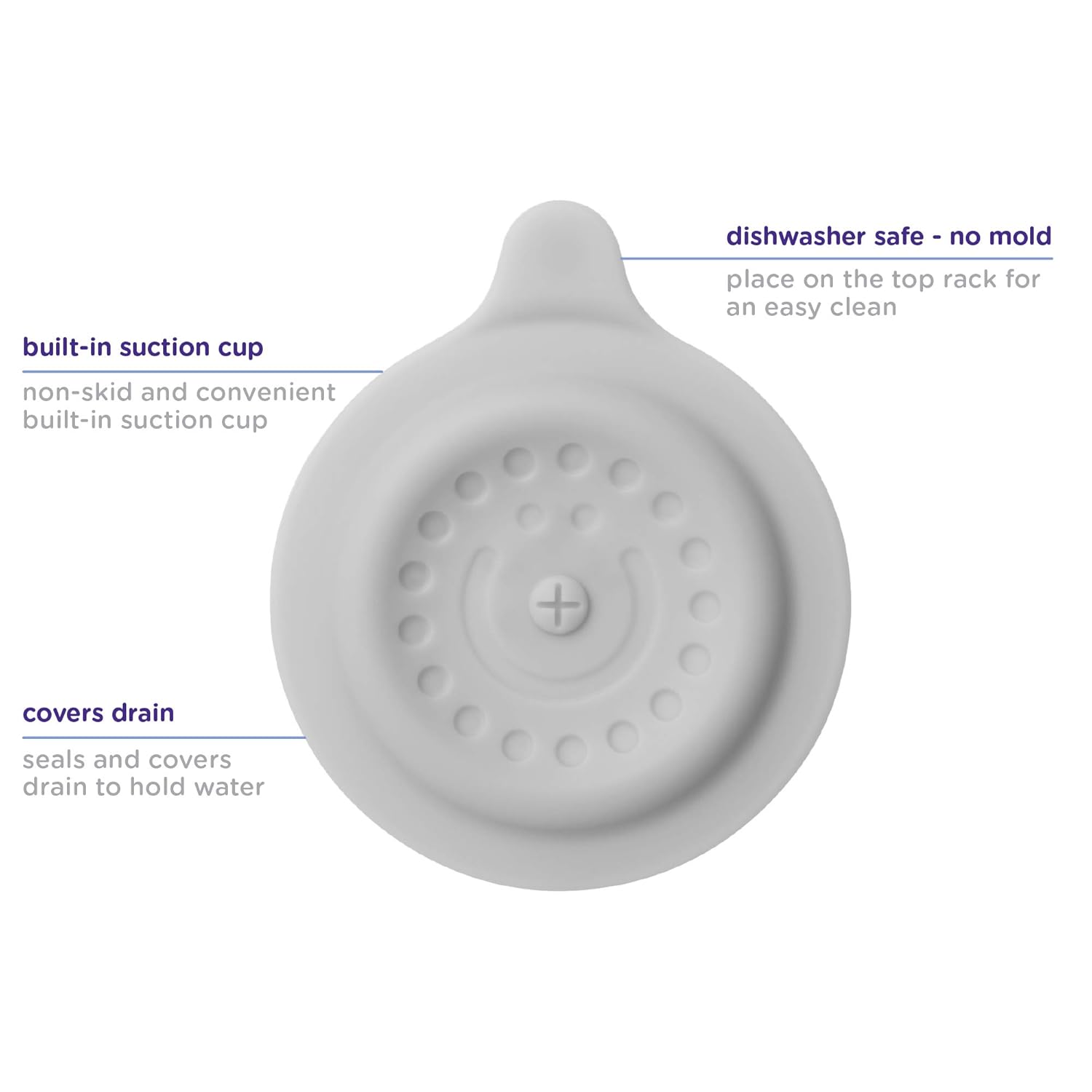 BUILT-IN SUCTION CUP: non-skid and convenient built-in suction cup secures the stopper and allows to hold water during baby bath time