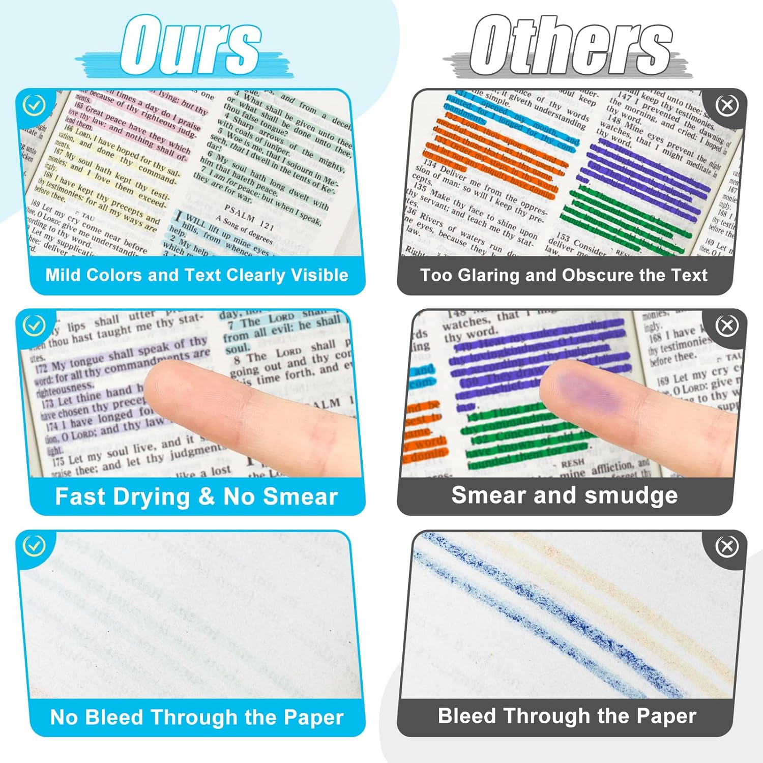 High quality non-bleed highlighter – Our highlighters feature soft chisel tips, and they glide smoothly across the paper, leaving vivid and precise marks without any smudging or bleeding, you don’t need to worry about compromising the readability of the next page of your book. It is great for Bible study, journaling, and book annotation.