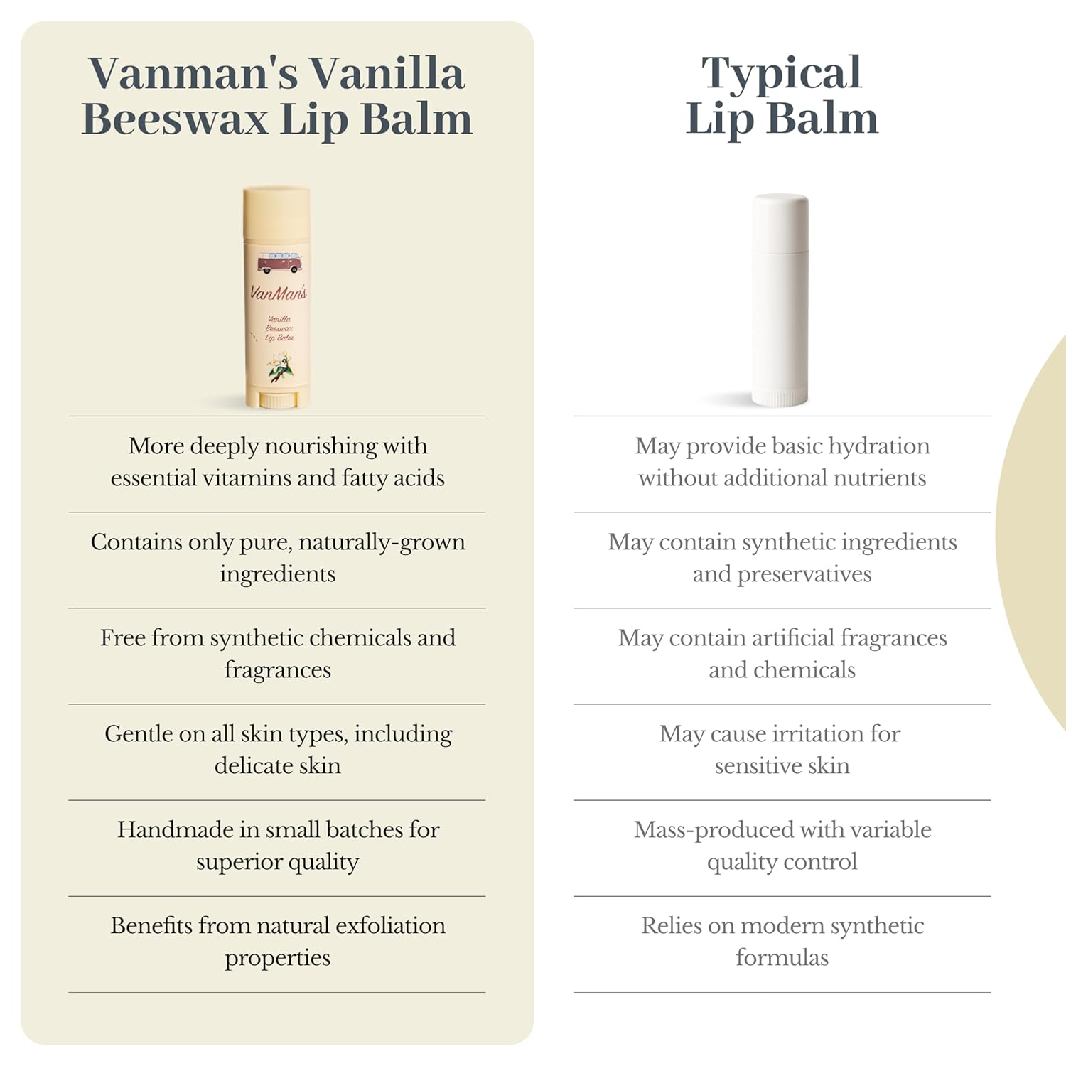 WARM VANILLA COMFORT: Vanman’s Beeswax Lip Balm is Infused with organic vanilla beans for a soft, calming scent and subtle sweetness. Adds a gentle warmth and soothing touch to every application.