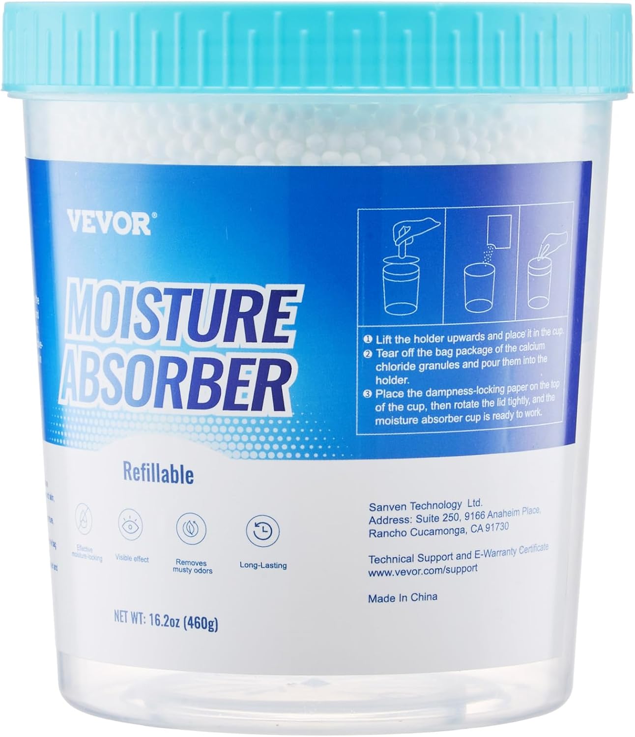 Reusable Outer Bucket: Once the dehumidifying agent is used up, simply refill the hi-capacity moisture absorber bucket with calcium chloride for a quick and easy replacement.