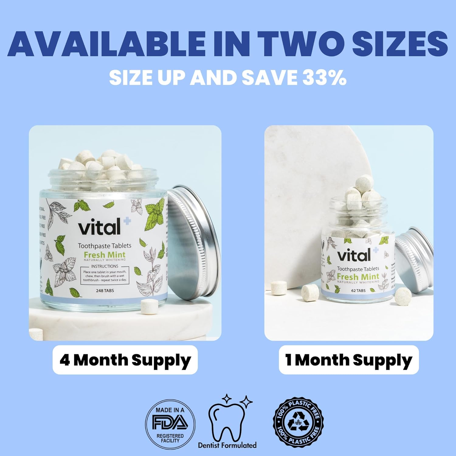 Vital Toothpaste Tabs with 7% Nano-Hydroxyapatite | Naturally Whitens + Remineralizes Teeth | Fluoride & Plastic Free | Combats Sensitivity | Travel & Eco Friendly | Fresh Mint | 62 Tablets (1 Month)