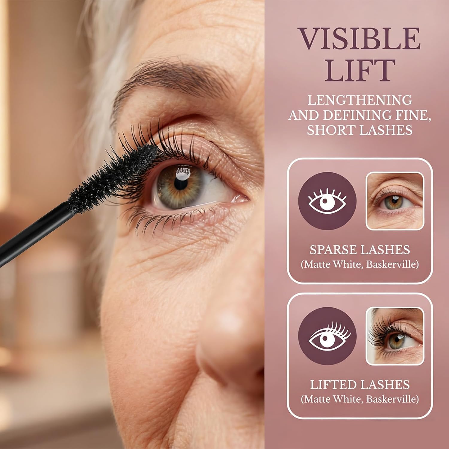 【DESIGNED FOR OLDER WOMEN】Crafted for women 50+, this mascara revitalizes sparse lashes, effortlessly lengthening, thickening, separating, and defining the short, fine lashes typical in women past 50. Say goodbye to the frustrations of ineffective mascaras!