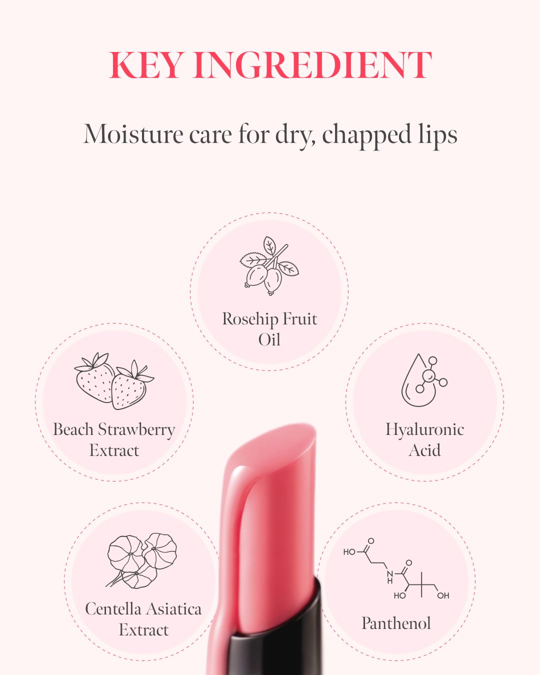 DEEP HYDRATION WITH 5 KEY INGREDIENTS Packed with nourishing Rosehip Oil, Hyaluronic Acid, Beach Strawberry Extract, Centella Asiatica, and Panthenol. This powerful soothes flakiness, protects the lip moisture barrier, and keeps lips soft and hydrated all day