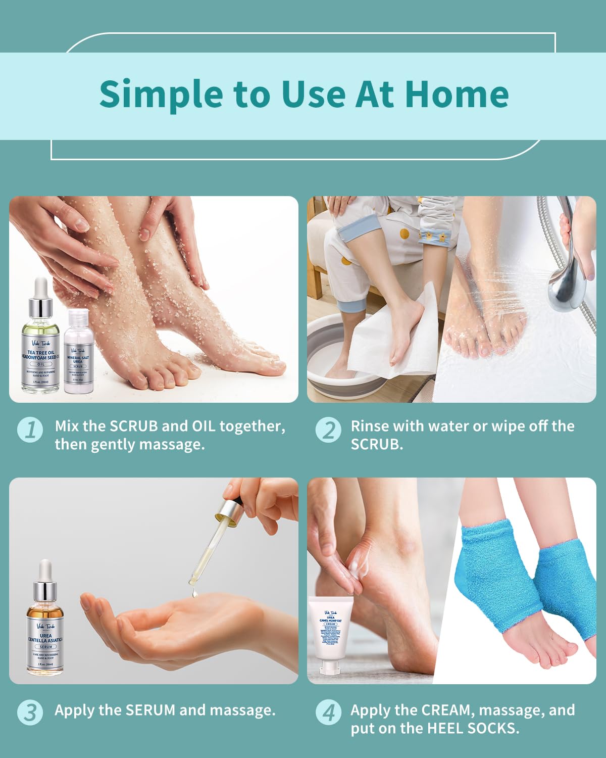 Deep Cleansing, Soothing & Repairing: The natural mineral salt scrub with urea is used with a blend of essential oils enriched with tea tree oil to quickly soften calluses and rough skin, helping to gently exfoliate and remove dead skin while hydrating and providing essential nutrients to dry skin. After scrubbing, apply a few drops of the serum evenly to soothe and deeply moisturize cracked skin. Leaves our hands and feet feeling soft, smooth, comfortable and clean.