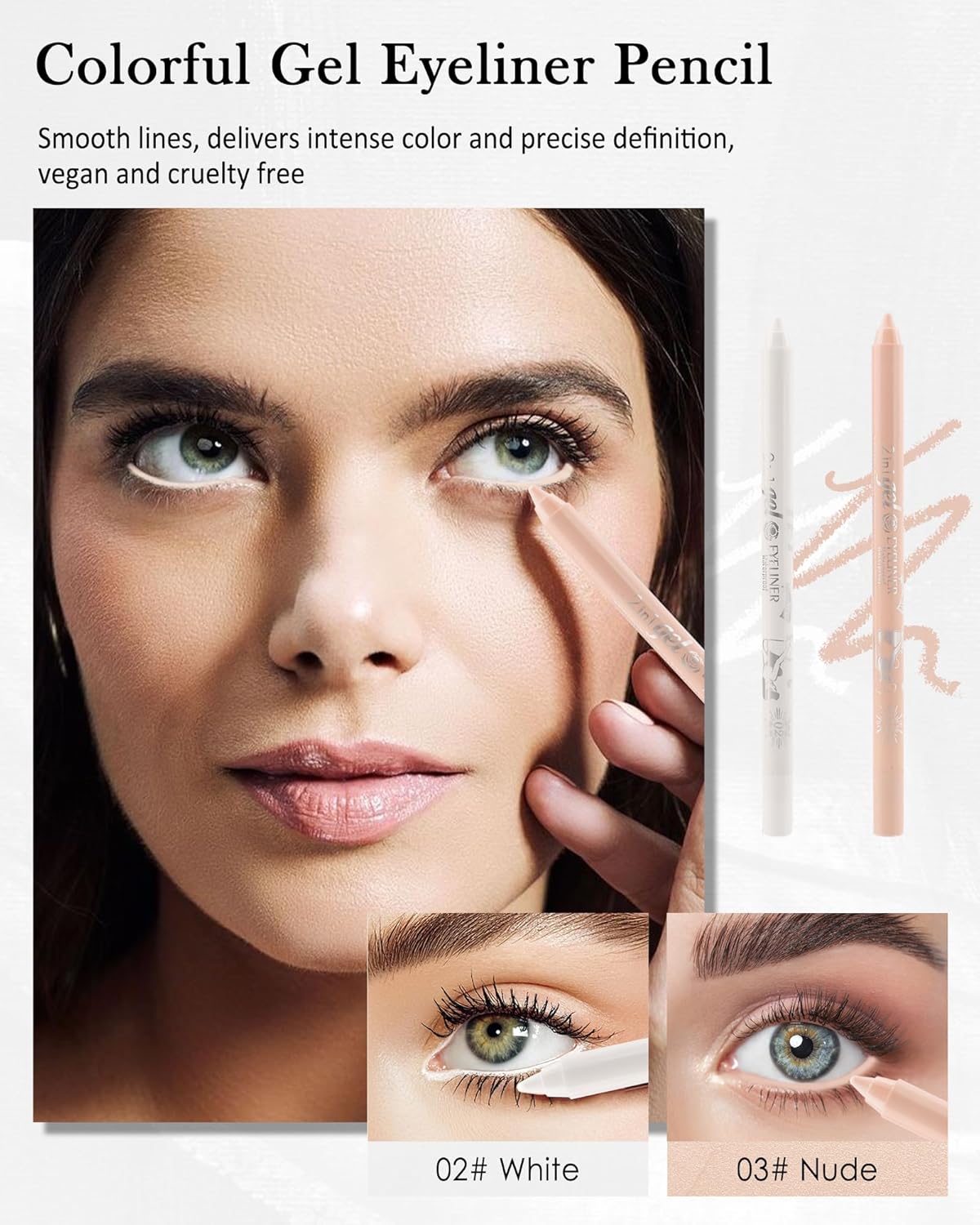 White Nude Waterline Eyeliner Gel Pencil, Long Stay Eyeliner Waterline Waterproof Smudge-Proof, Safe for Sensitive Eyes, Eye Liner Brightener Pen with Sharpener, Soft Cream Rich Color Eye Makeup Pen