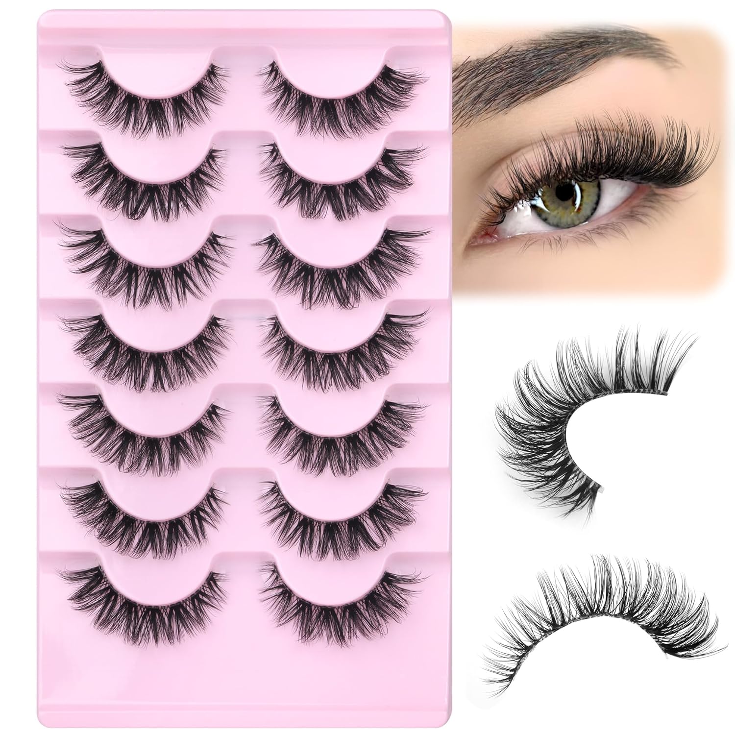 Wispy Cat Eye Lashes Pack: Enhance your eyes with our wispy 7 pairs eye lashes pack, featuring a delicate cat eye design that gently elongates the outer corners for a subtle lift, offering a soft, feathery eyelash look perfect for any occasions